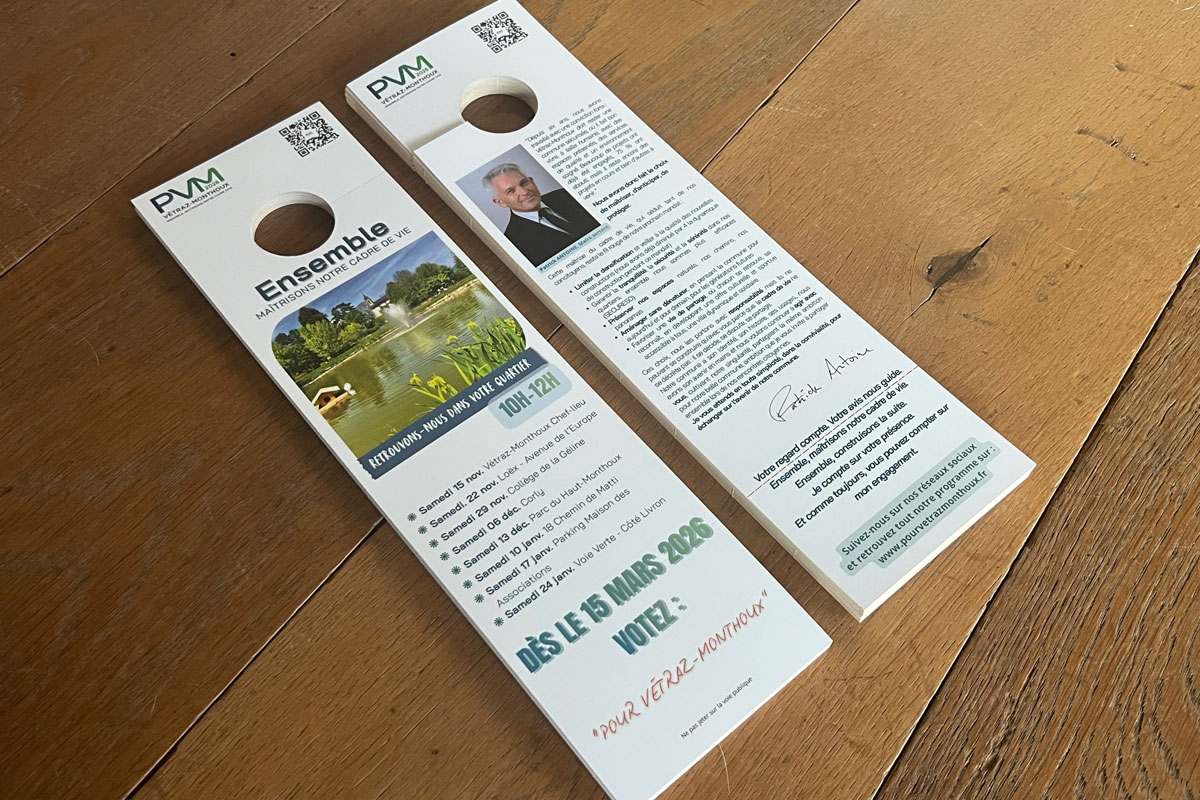 Objectifs : Dans le cadre du lancement de sa campagne électorale, la liste souhaitait présenter ses membres aux administrés. Pour cela, elle nous a confié l’impression de supports de communication sous forme d’accroche-portes.