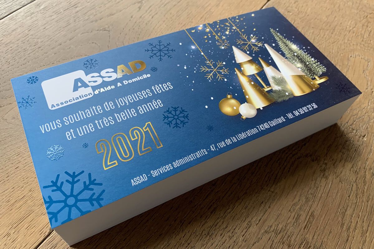 - Impression quadri sur papier couché mat 350g & Finition vernis sélectif