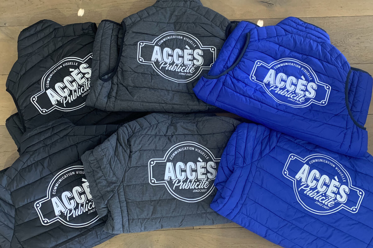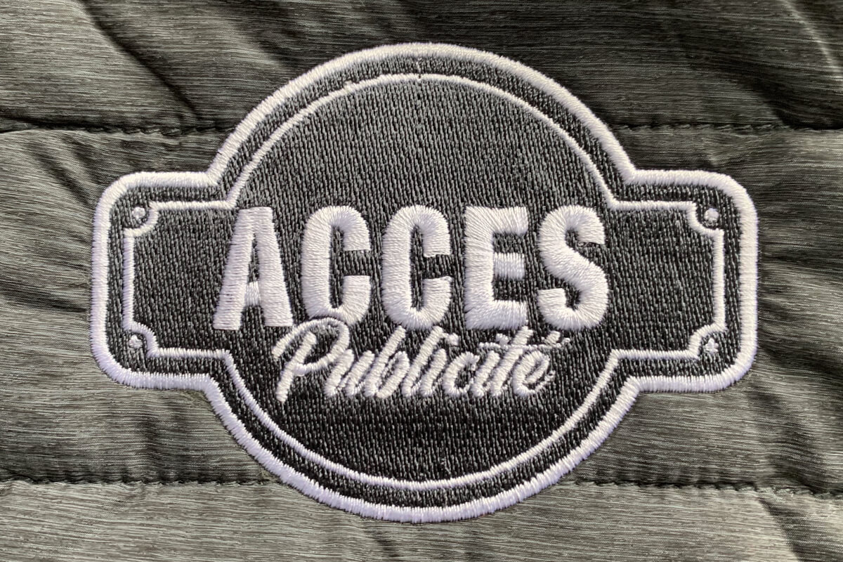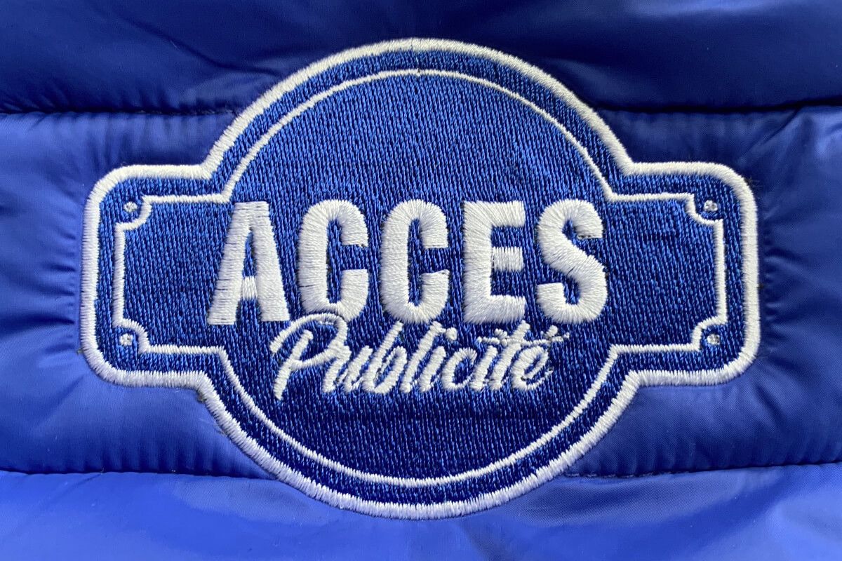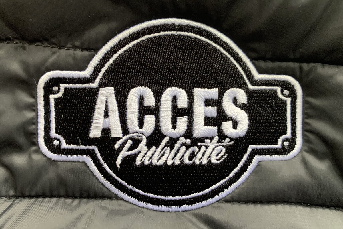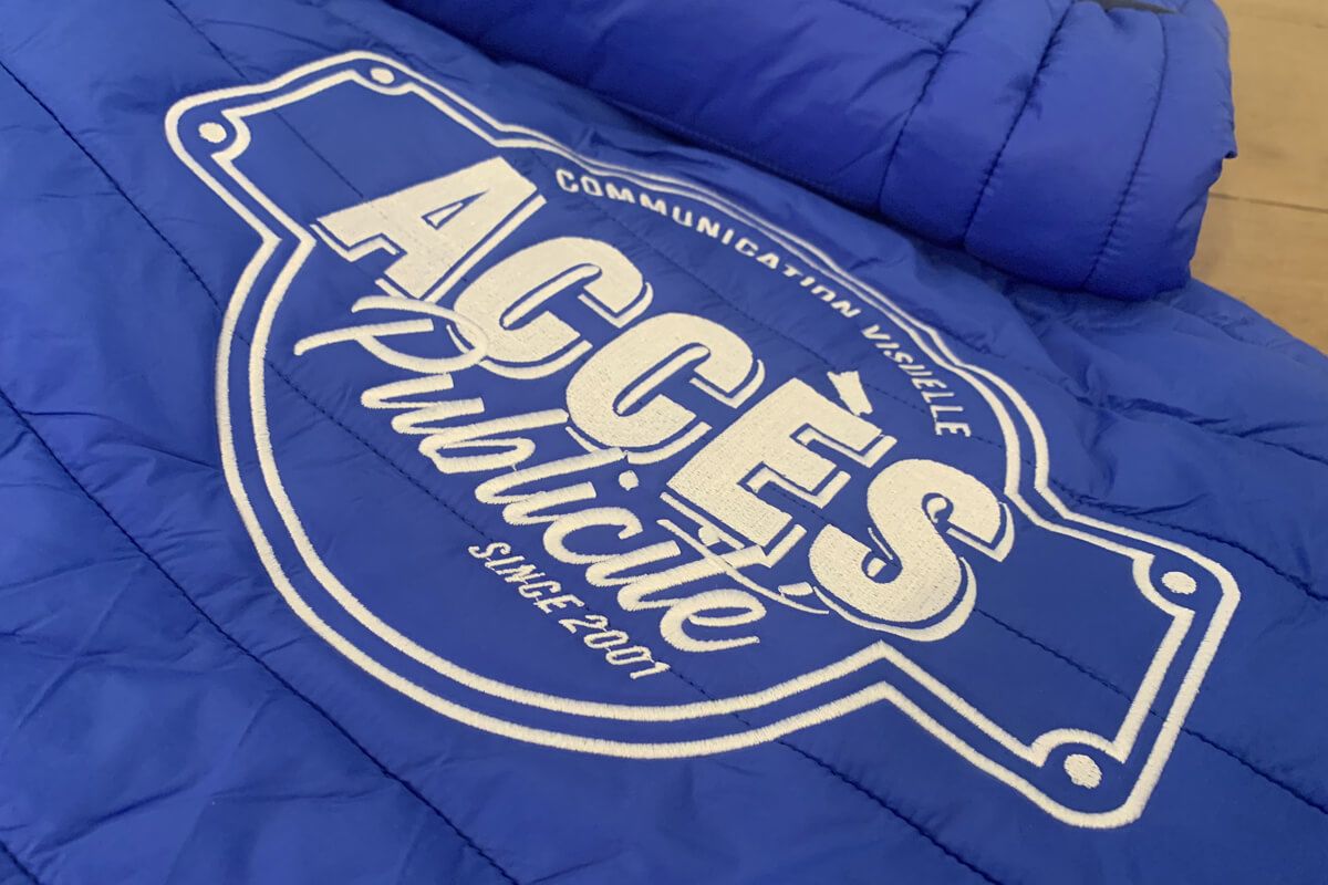 - Doudounes avec et sans manches : Broderie du logo plein dos + écussons brodés sur la poitrine