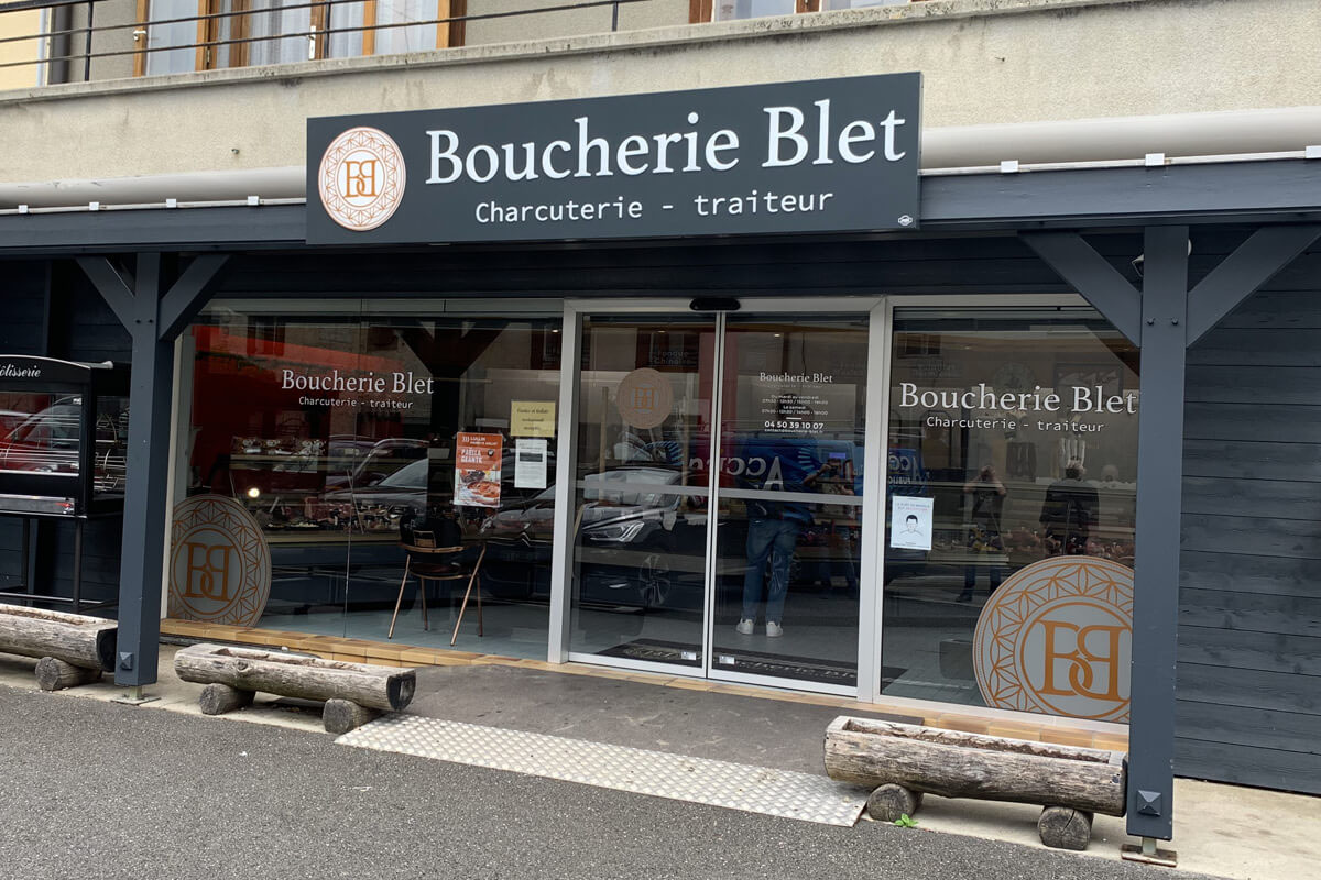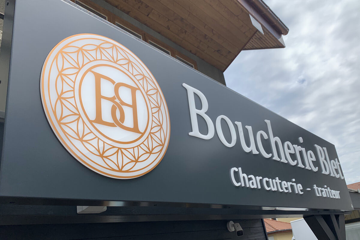Objectifs : Ayant déjà réalisé le logo, les supports de communication et la décoration de la vitrine, il ne manquait plus que l’enseigne du magasin pour que la boucherie Blet impose son identité au sein de la commune.