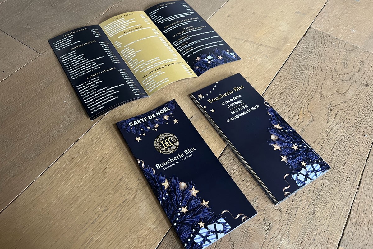 Objectifs : Après avoir réalisé la carte de noël 2021 et l’ensemble de la charte graphique (logo, carte de visite, décoration de la vitrine, enseigne et goodies), notre client souhaitait proposer à ses clients un tout nouveau graphisme pour l’Édition 2022.