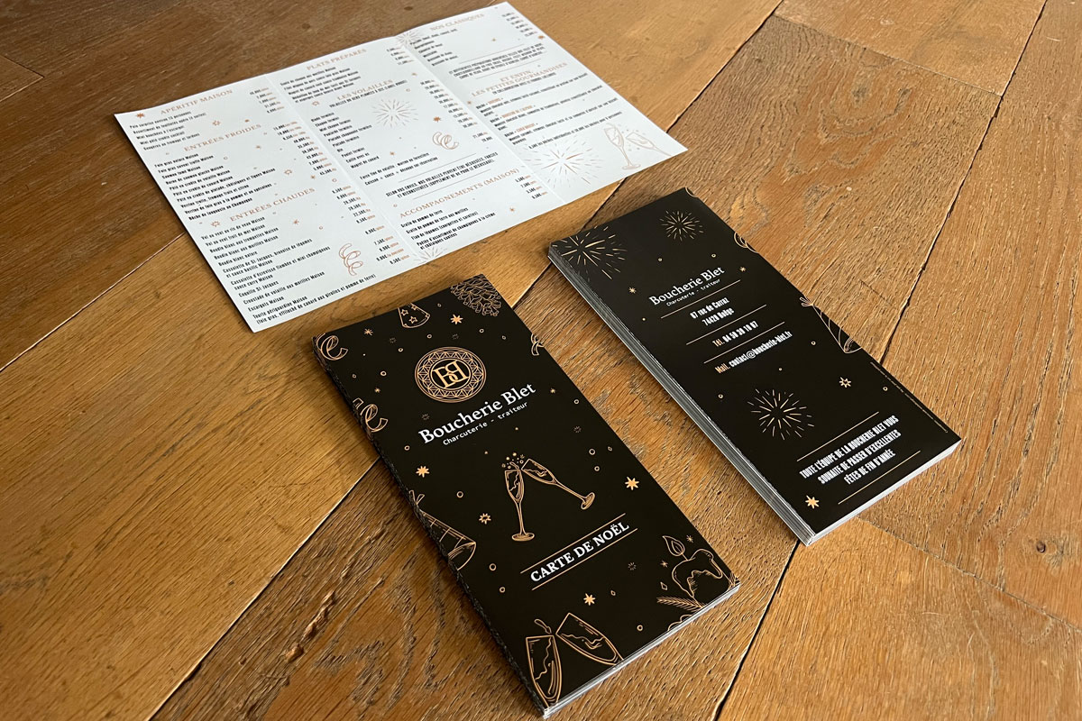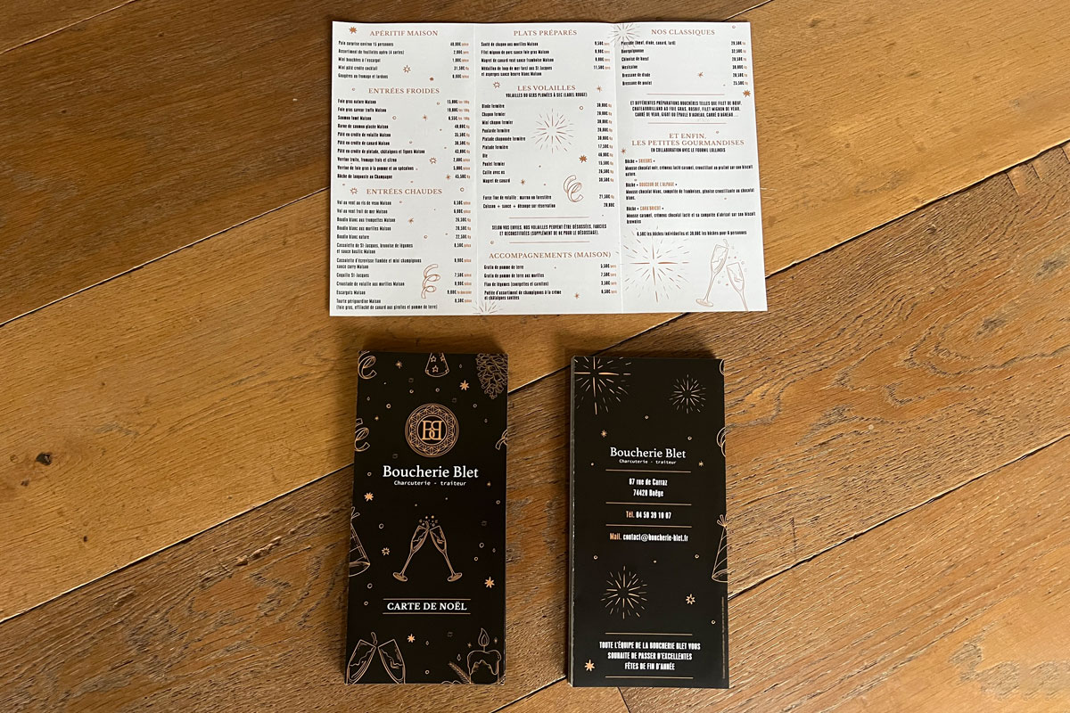 Objectifs : Comme chaque année, la Boucherie Blet a fait appel à nos services pour concevoir une carte originale mettant en valeur les produits festifs proposés pour les fêtes.