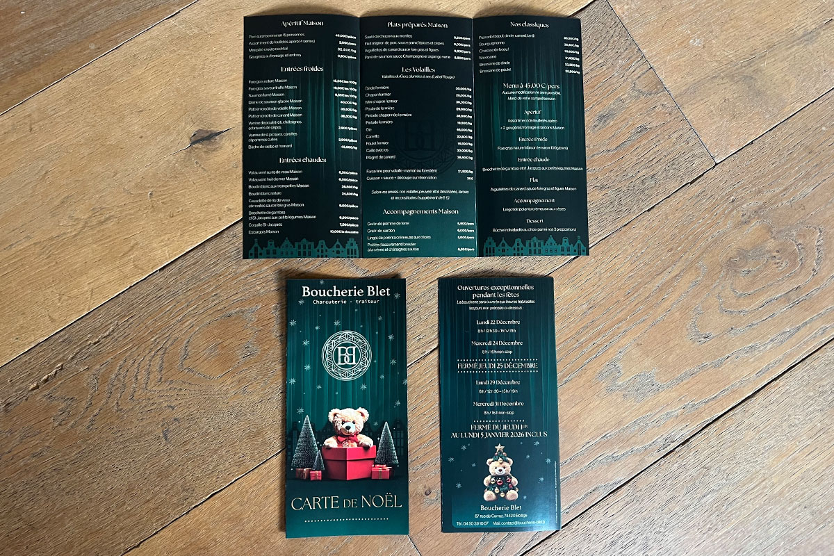 Objectifs : Comme chaque année, la Boucherie Blet a fait appel à nos services pour concevoir une carte originale mettant en valeur les produits festifs proposés pour les fêtes.