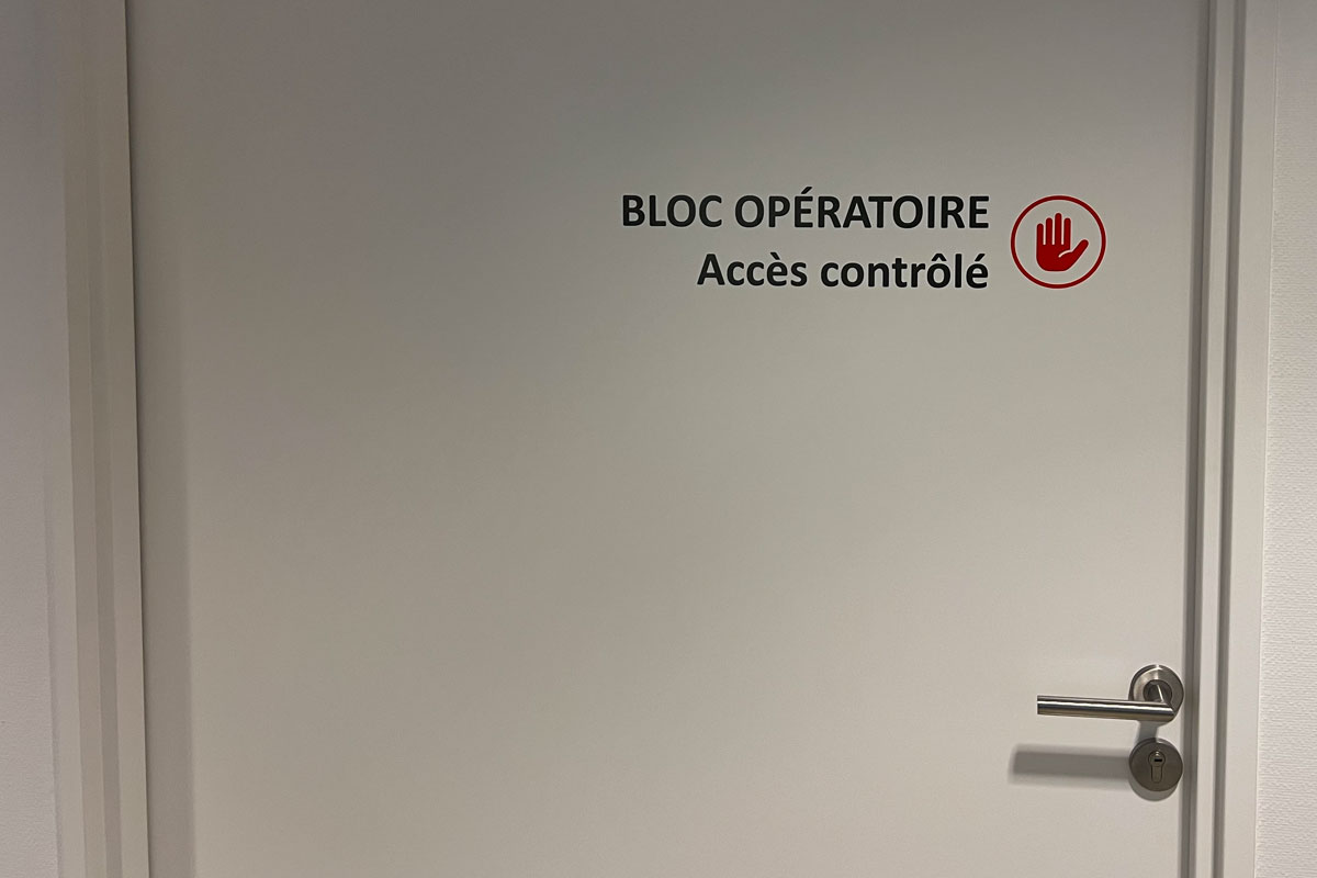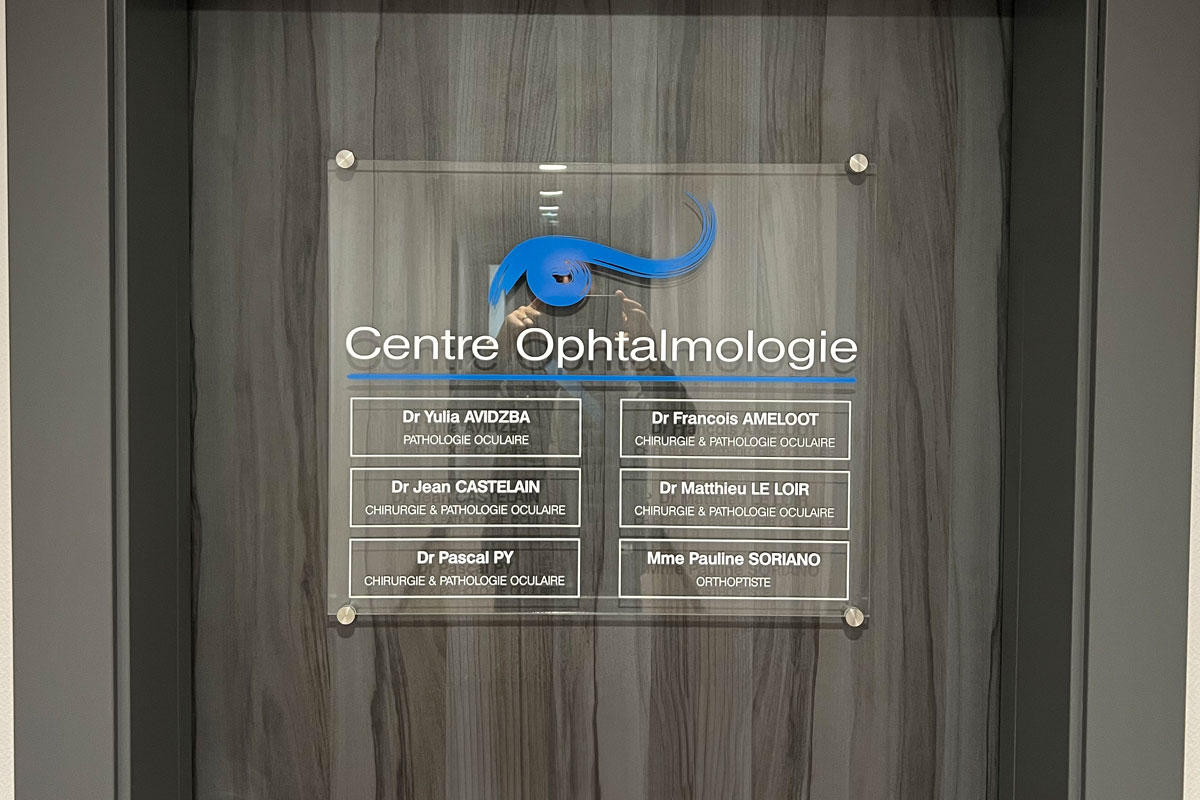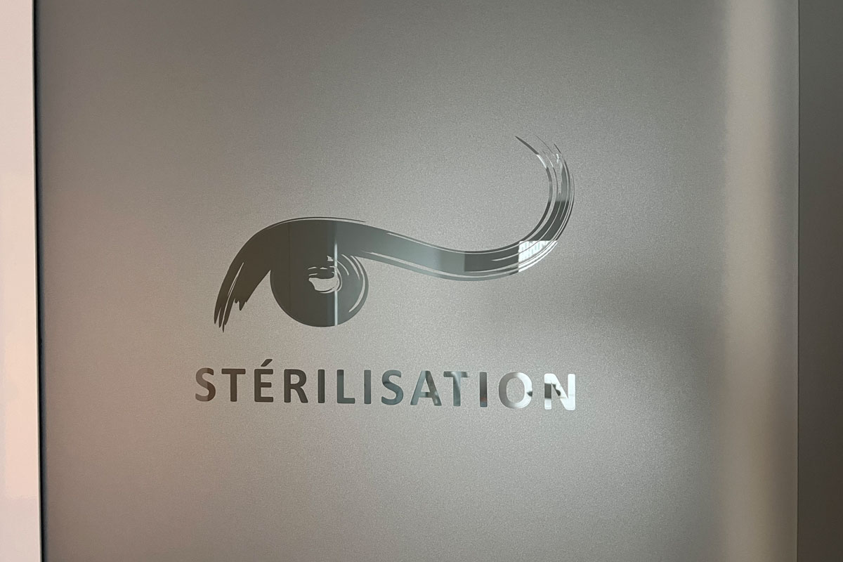 - Plaque médecins : Plaque plexi montée sur entretoises avec décor en adhésifs teinté masse