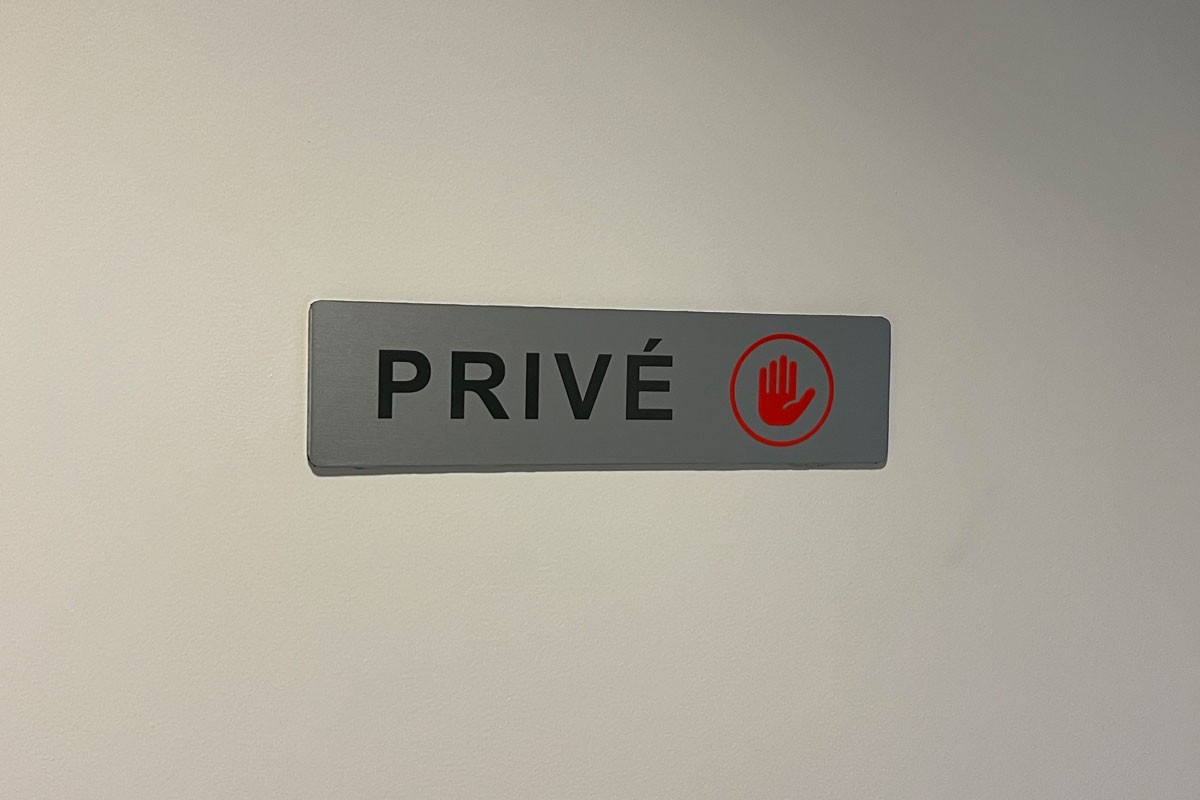 - Plaque Privé : Plaque Alu dibond avec coins arrondis & décor en adhésifs teinté masse