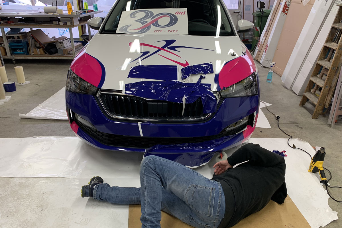 Solution : OAK-Webdesign a réalisé la conception graphique et a confié la réalisation technique à notre partenaire Accès Publicité. L’ensemble des éléments sont découpés dans de l’adhésif teinté masse et appliqués selon la technique du wrapping ce qui permet de se substituer complètement à la couleur d’origine de la carrosserie.