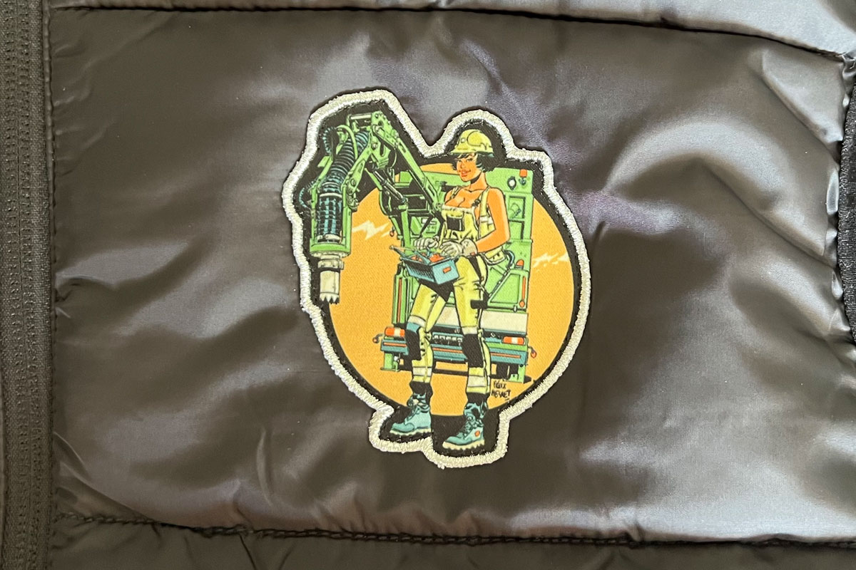 - Écusson brodé avec bourdon américain sur la poitrine + texte en broderie plein dos
