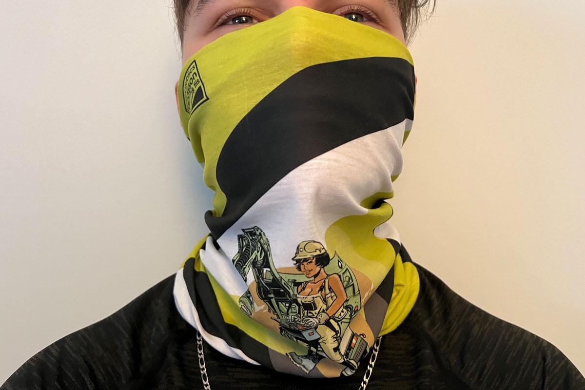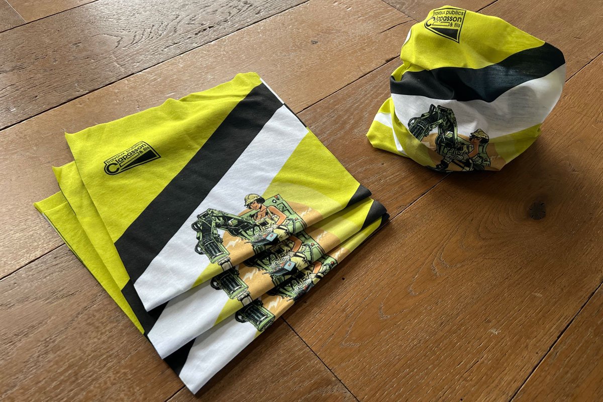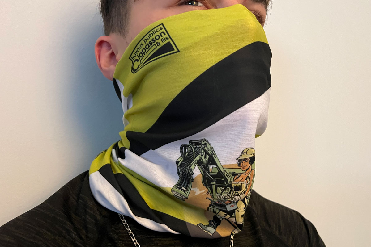 Objectifs : Après avoir travaillé sur la création de ses 2 sites Internet et de ses différents supports de communication, notre client a souhaité nous confier la personnalisation de Buff à offrir à ses clients.