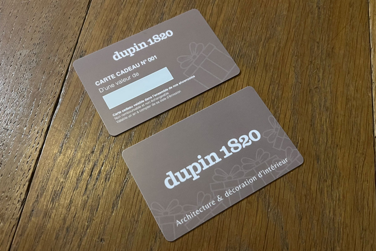 - Carte cadeau : Impression quadri sur carte PVC 0,76mm & Pelliculage mat - Numérotation individuelle & Zone d’écriture au Verso