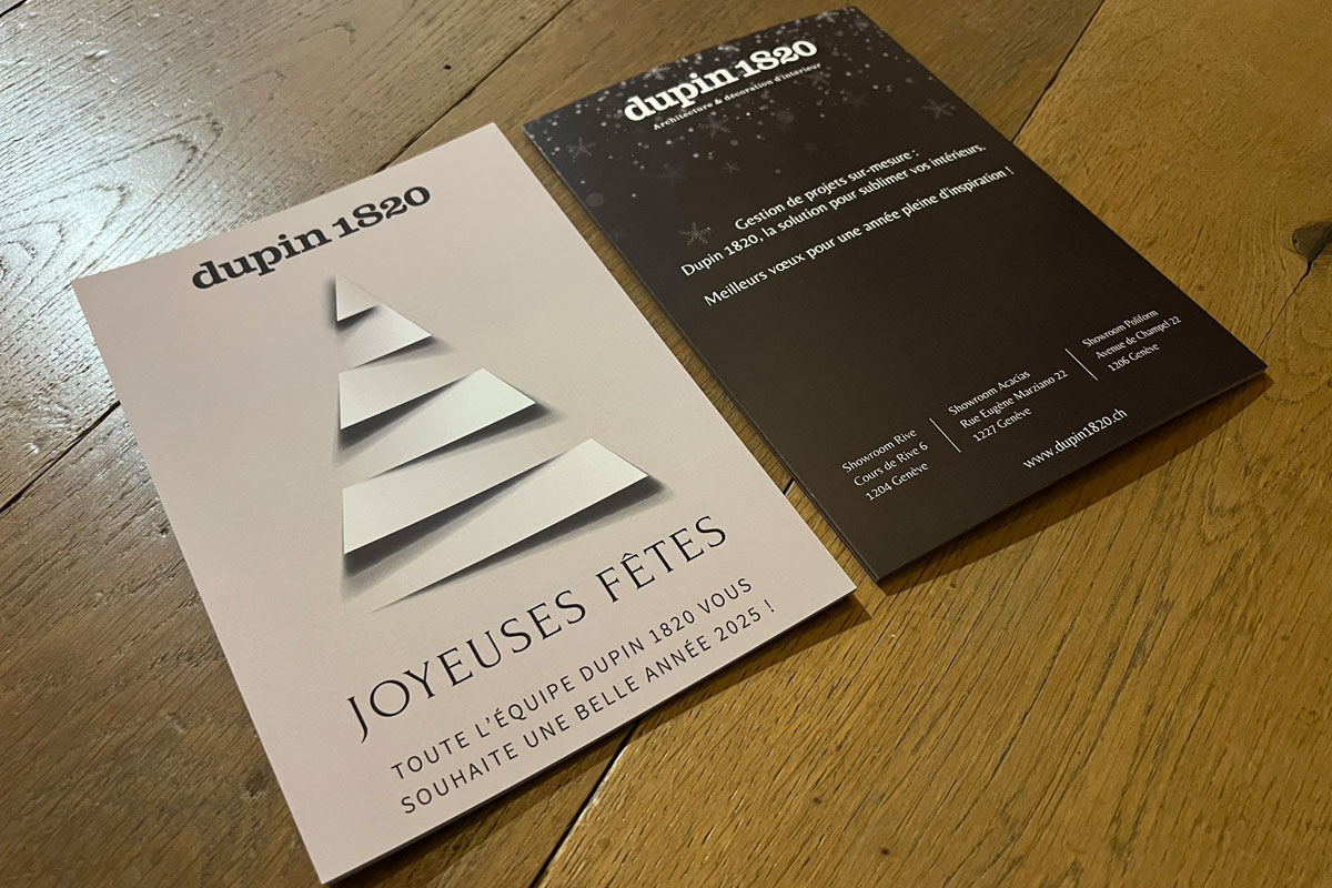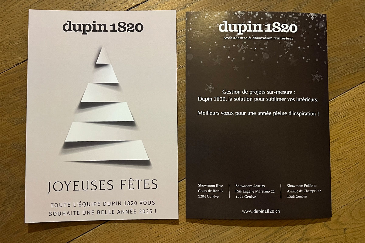 Solution : OAK-Webdesign a imaginé une carte de vœux au design très graphique, mettant en avant un sapin à effet 3D, en clin d’œil aux projets d’architecture réalisés par Dupin 1820. Afin d’assurer un rendu parfait, une 1ère production a été éditée avec différents nuanciers de couleur, permettant ainsi de valider le résultat final en accord avec les attentes du client.
