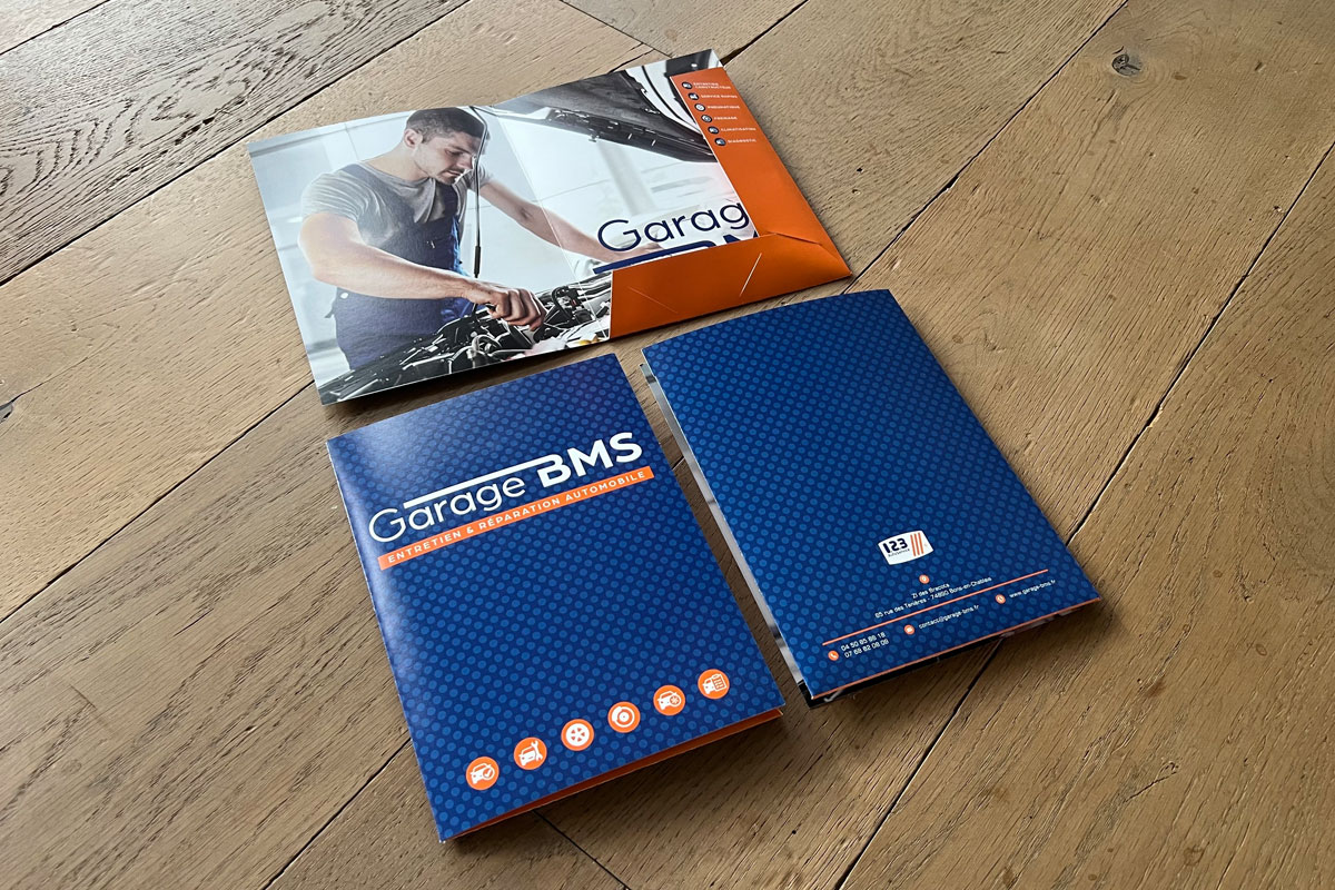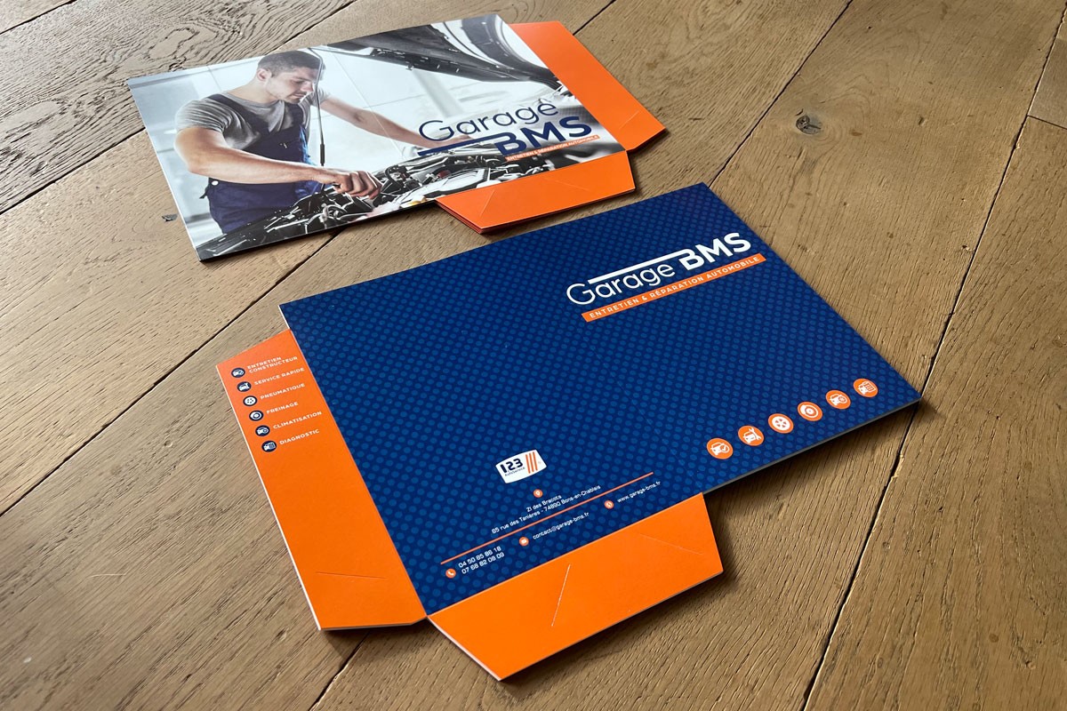 Objectifs : Après l’identité visuelle, le flyer et les cartes de visite, notre client souhaitait réaliser de petites pochettes à rabats pouvant accueillir les documents administratifs remis aux clients.