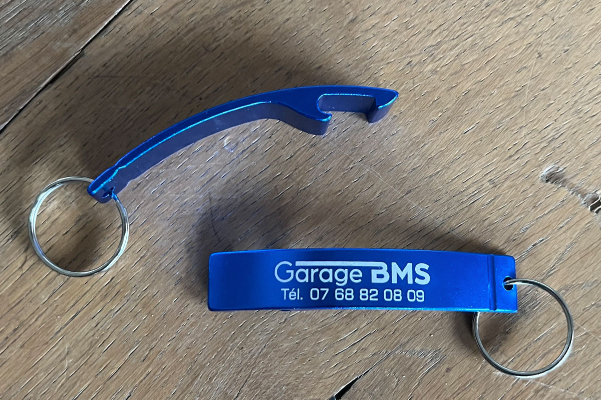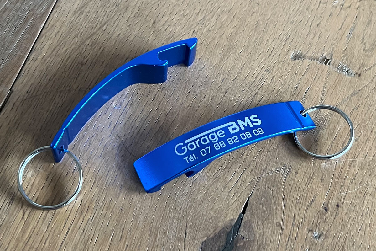 - Porte-clés décapsuleur en aluminium avec marquage en gravure laser