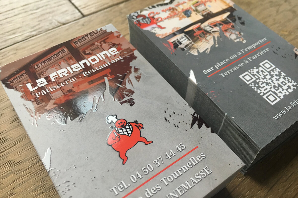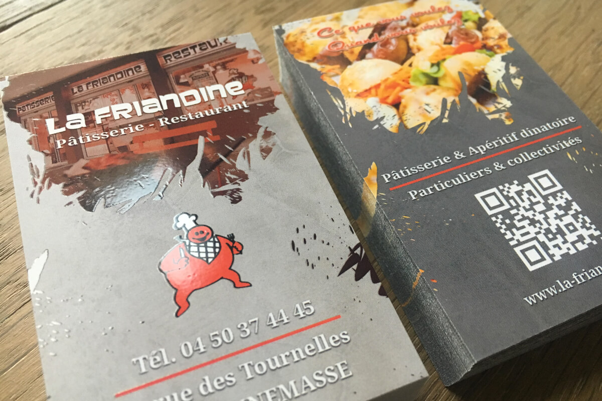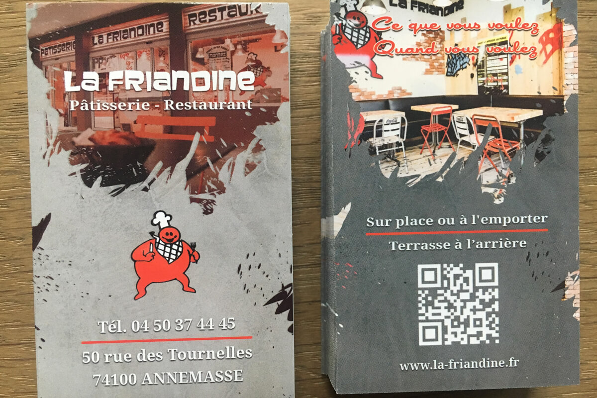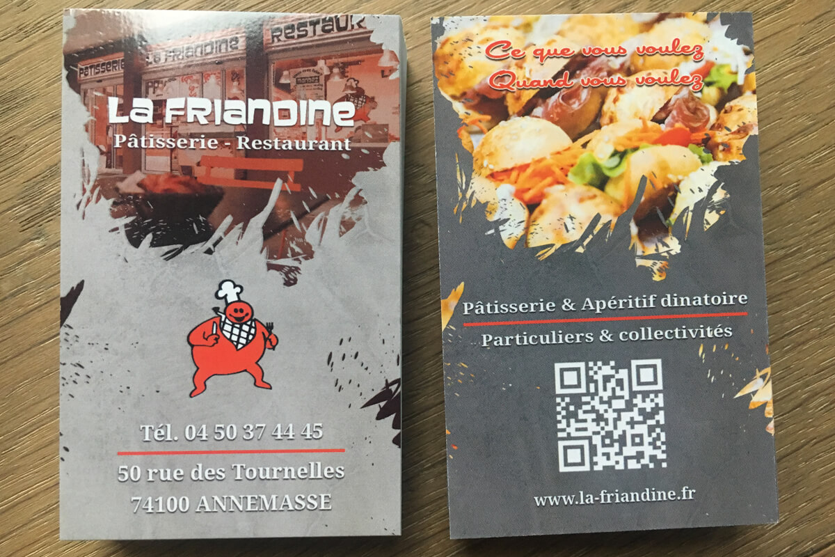 Objectifs : La Friandine a décidé en 2017 de refaire sa salle avec l’aide d’un architecte d’intérieur ... Le résultat surprenant d’un "effet chantier" en fait un endroit remarquable. M. Perrillat nous commande alors son site Internet et nous demande de refaire son catalogue pâtisseries et apéritifs au début 2018. Aujourd’hui, pour compléter sa communication il nous demande la réalisation de ses cartes de visite.