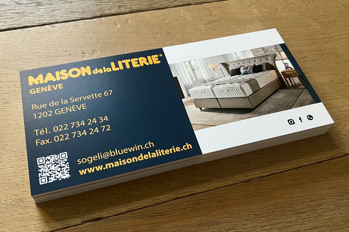 - Carte de visite = Impression quadri sur papier couché mat 350g & Finition vernis sélectif