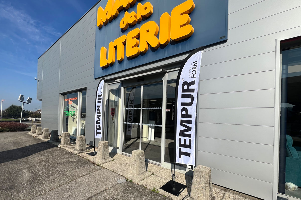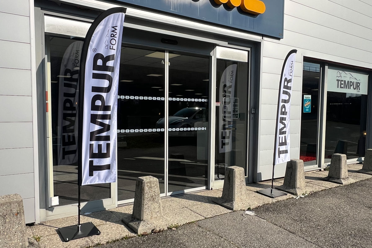 Solution : OAK-Webdesign a adapté le logo Tempur en y intégrant la notion de Form. Une fois validé, ce visuel a été décliné sur des oriflammes, positionnées à l’entrée du magasin pour maximiser l’impact visuel.