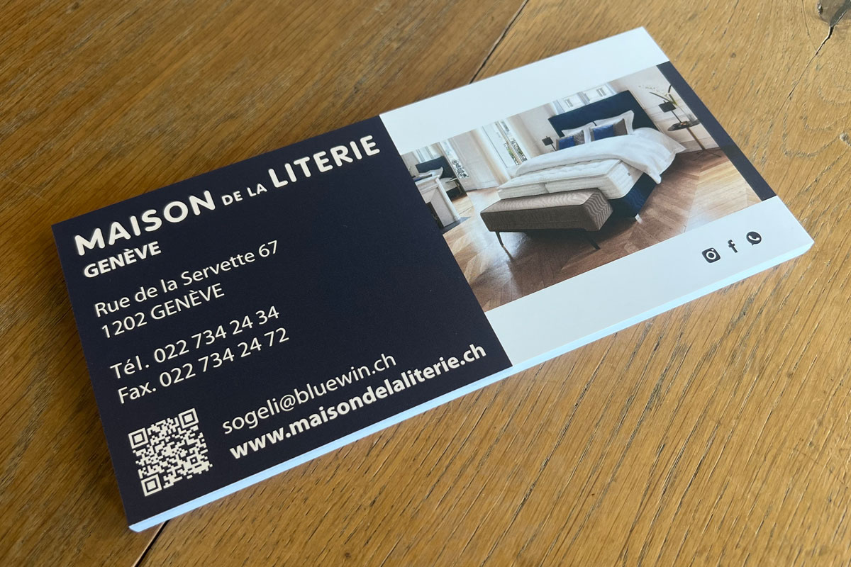 - Carte de visite = Impression quadri sur papier couché mat 350g & Finition vernis sélectif