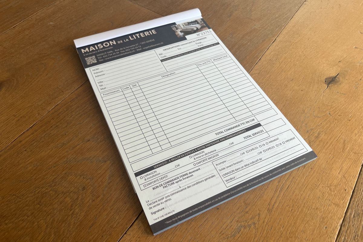 - Bons de commande / Carnets autocopiants = Impression quadri sur 2 feuillets de 70g & Numérotation individuelle