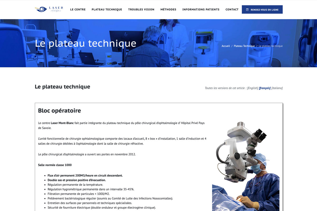 Contexte : Le Centre Genevois Laser change de nom pour devenir le Centre Laser Mont-Blanc. Sa mission est de mettre à disposition des médecins spécialisés en chirurgie réfractive une plateforme technique complète (laser Excimer, Femtolaser, topographe de reconnaissance irienne, etc.), en partenariat avec l’Hôpital Privé Pays de Savoie pour la réalisation d’interventions à visée réfractive (Femtolasik, Femtolaser, laser Excimer).