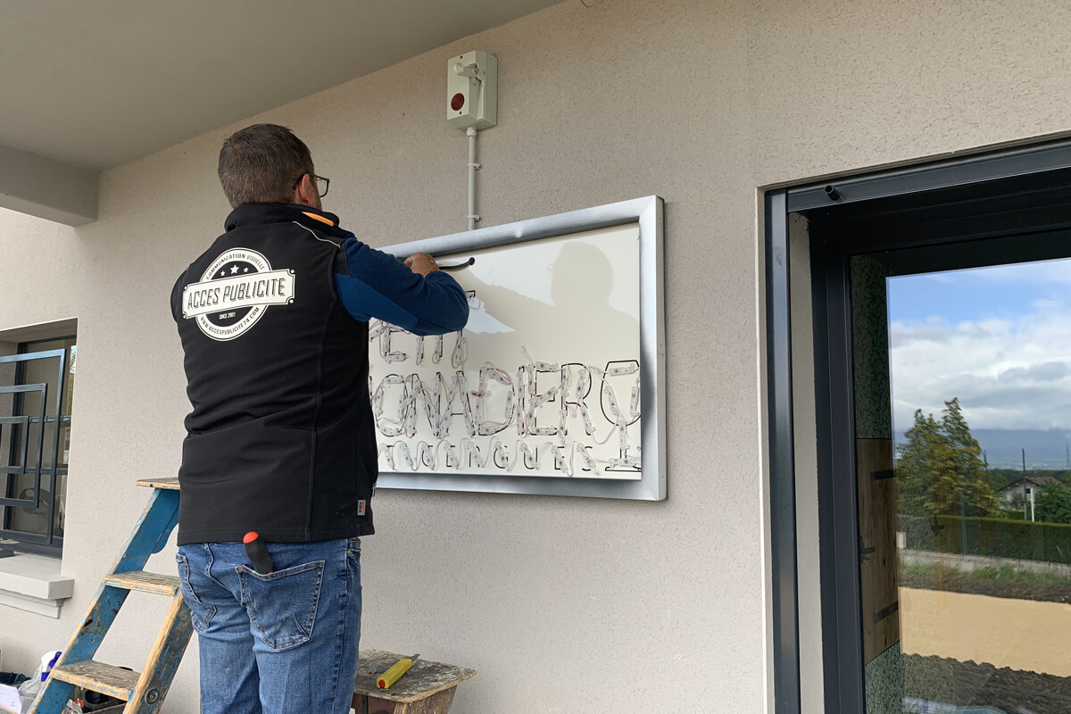 Objectifs : Après avoir créé l’identité visuelle, notre cliente souhaitait informer les villageois de l’ouverture de son établissement en installant une enseigne et en affichant ses horaires d’ouverture sur la façade de son bâtiment.