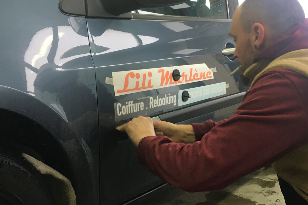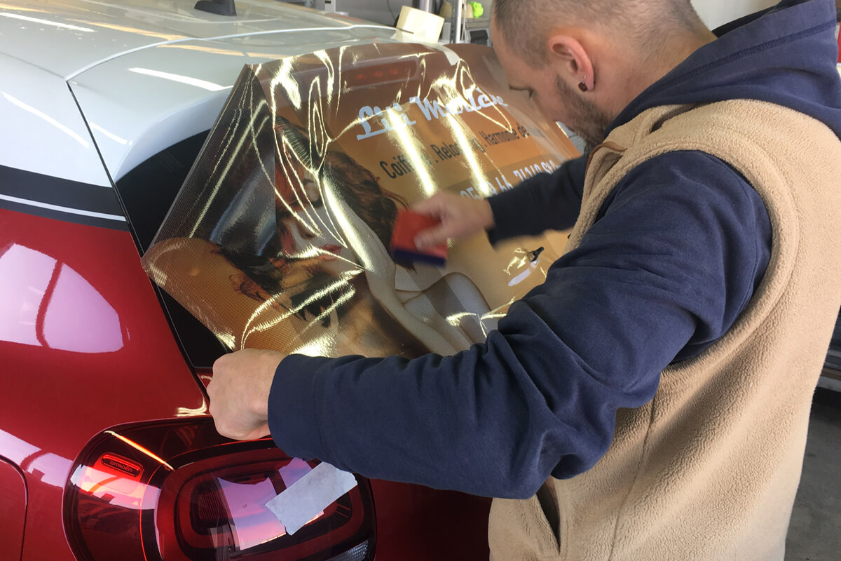 - Covering : Impression numérique sur adhésif micro-perforé & décor adhésif teinté pleine masse