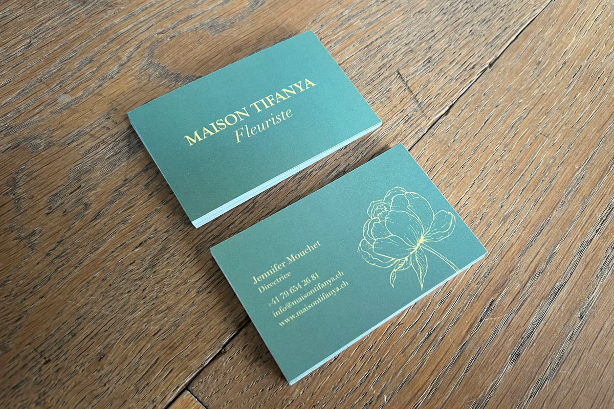 Solution : OAK-Webdesign a entièrement repris la charte graphique, vectorisé l’ensemble des éléments et intégré un effet feuille d’or venant contraster élégamment avec le fond vert de la marque. Une fois le projet validé, nous avons assuré l’impression avec une finition SoftTouch, apportant douceur et raffinement aux cartes.