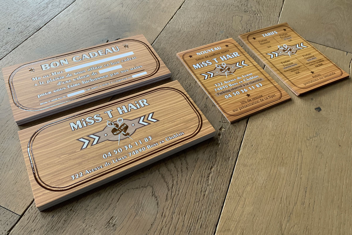 - Bon cadeau = Impression quadri sur papier couché mat 350g & Finition vernis sélectif