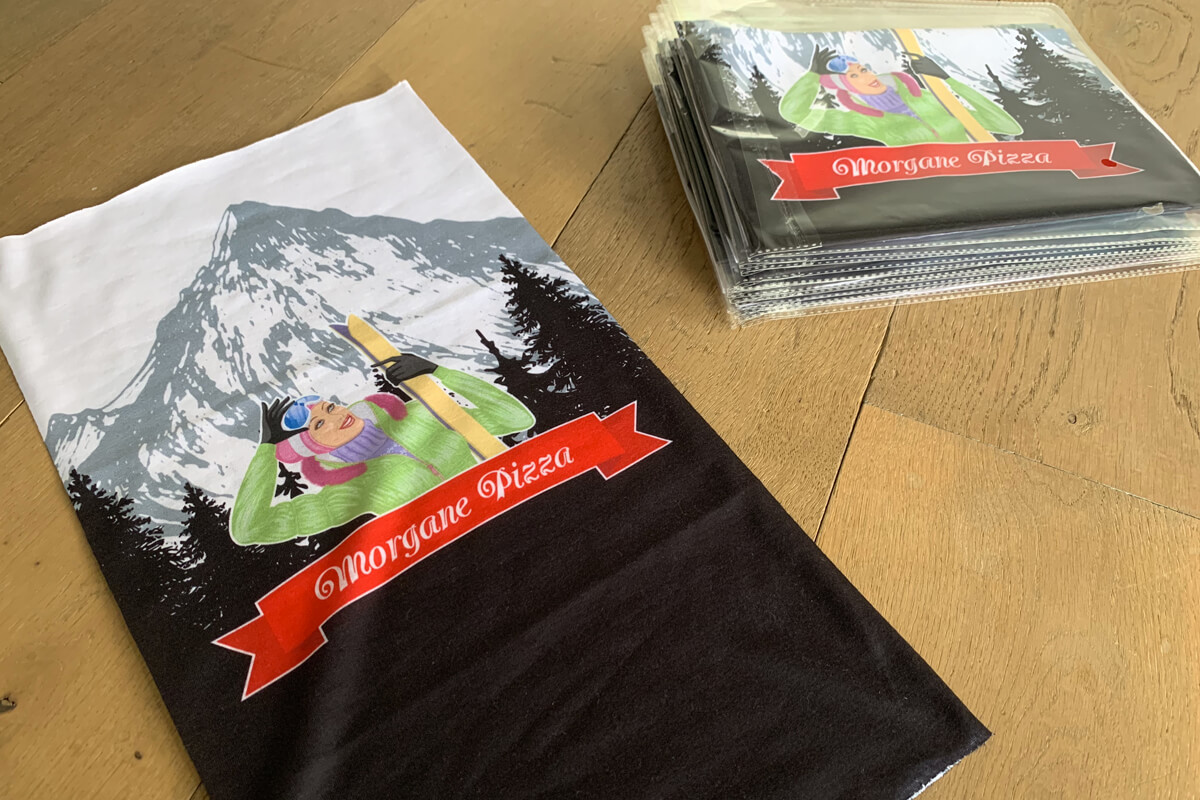Solution : Après étude, OAK-Webdesign a proposé le « Buff » et a travaillé le visuel pour couvrir l’intégralité de sa surface. Nous avons également réalisé 2 types de stickers afin de personnaliser les pochettes cadeaux.