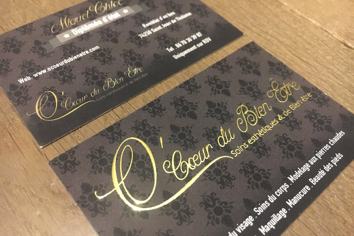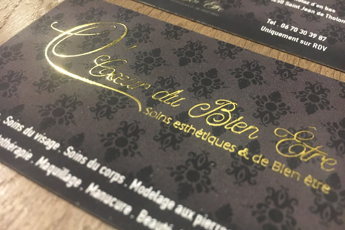 - Carte de visite : Impression quadri sur papier couché mat 350g & Pelliculage Soft Touch + Finition dorure à chaud