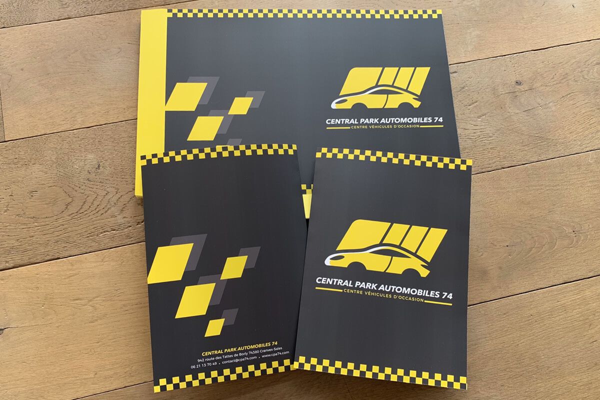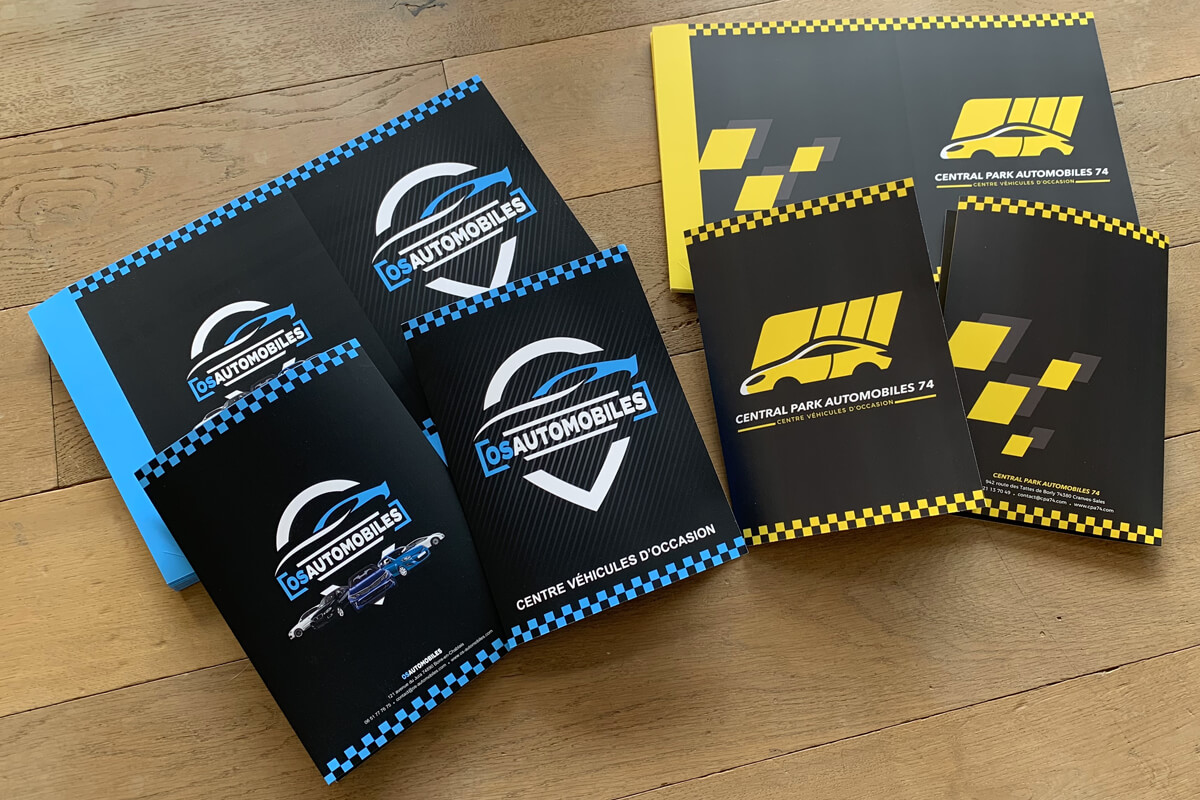 Objectifs : Après avoir réalisé l’ensemble des éléments composant la charte graphique des 2 entreprises, notre client souhaitait réaliser des pochettes à rabats permettant de rassembler les documents liés à la vente d’un véhicule.