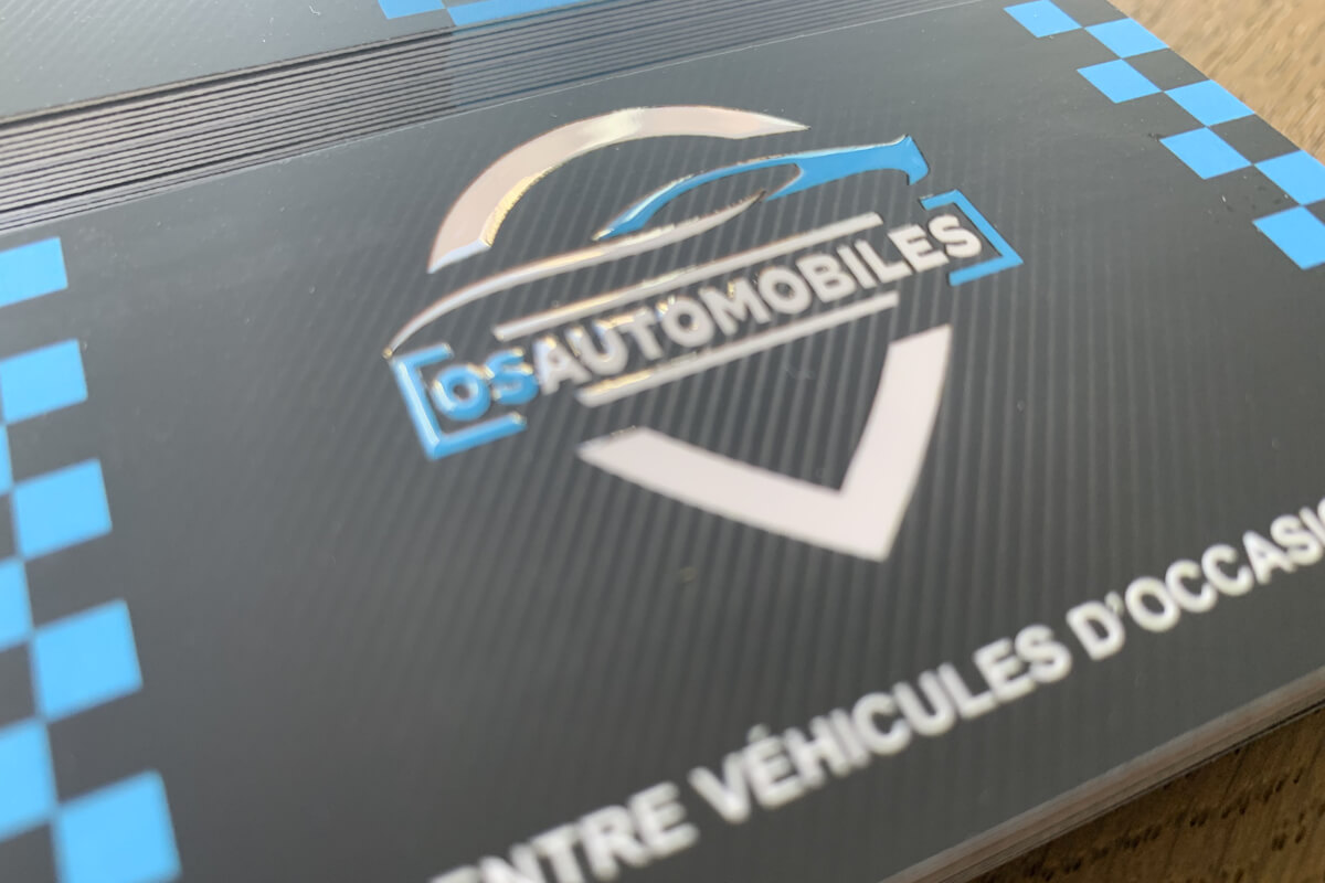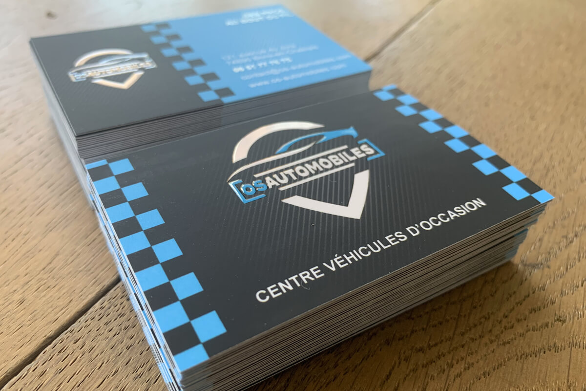 - Carte de visite = Impression quadri sur papier couché mat 350g + Pelliculage Soft touch & Finition vernis sélectif 3D