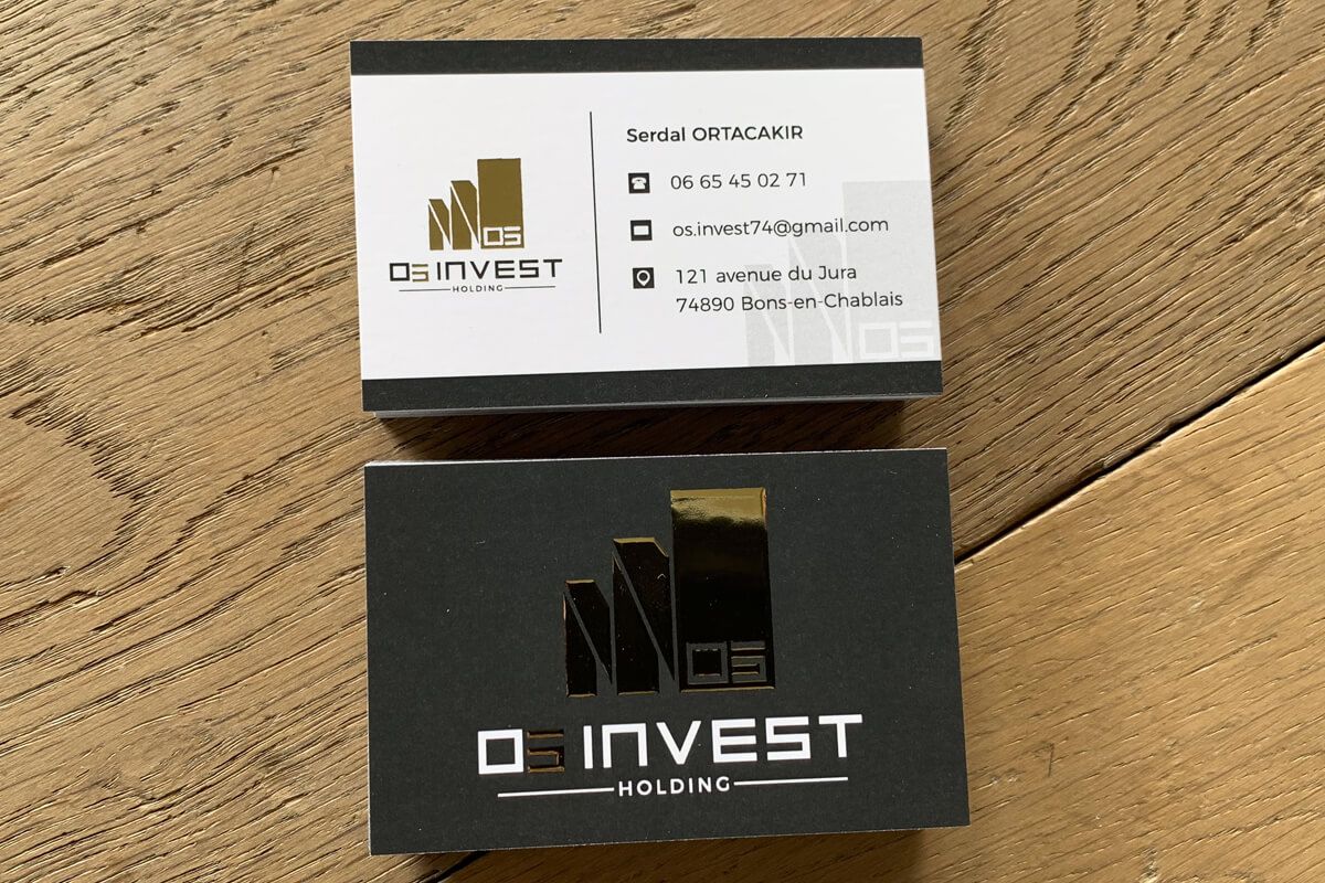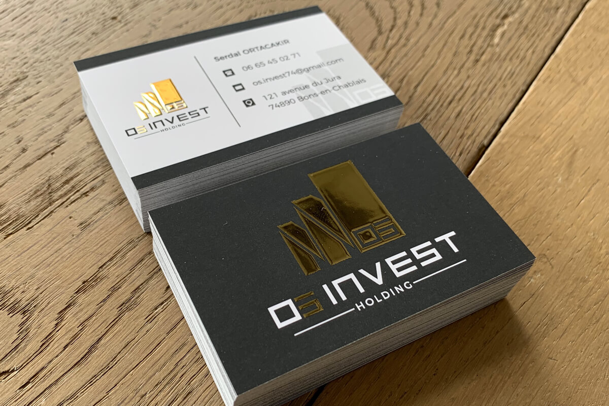 - Carte de visite = Impression quadri sur papier couché mat 350g + Pelliculage SoftTouch & Finition dorure à chaud 3D