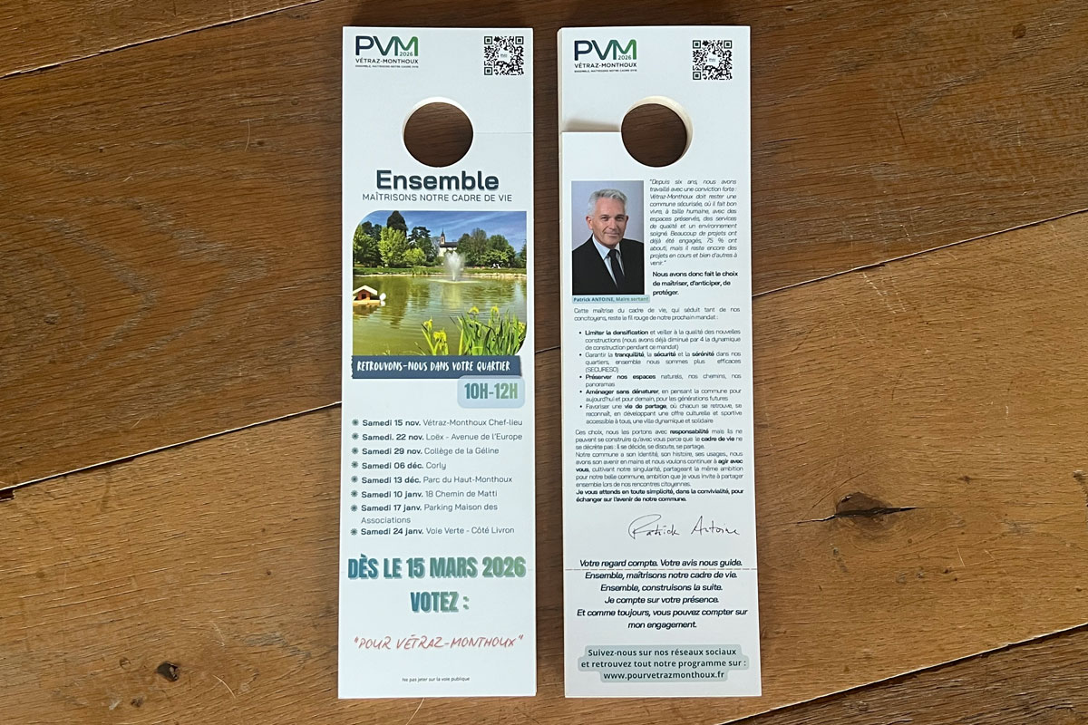 Objectifs : Dans le cadre du lancement de sa campagne électorale, la liste souhaitait présenter ses membres aux administrés. Pour cela, elle nous a confié l’impression de supports de communication sous forme d’accroche-portes.