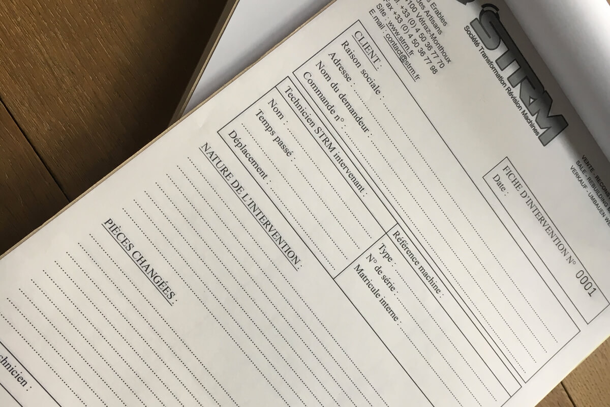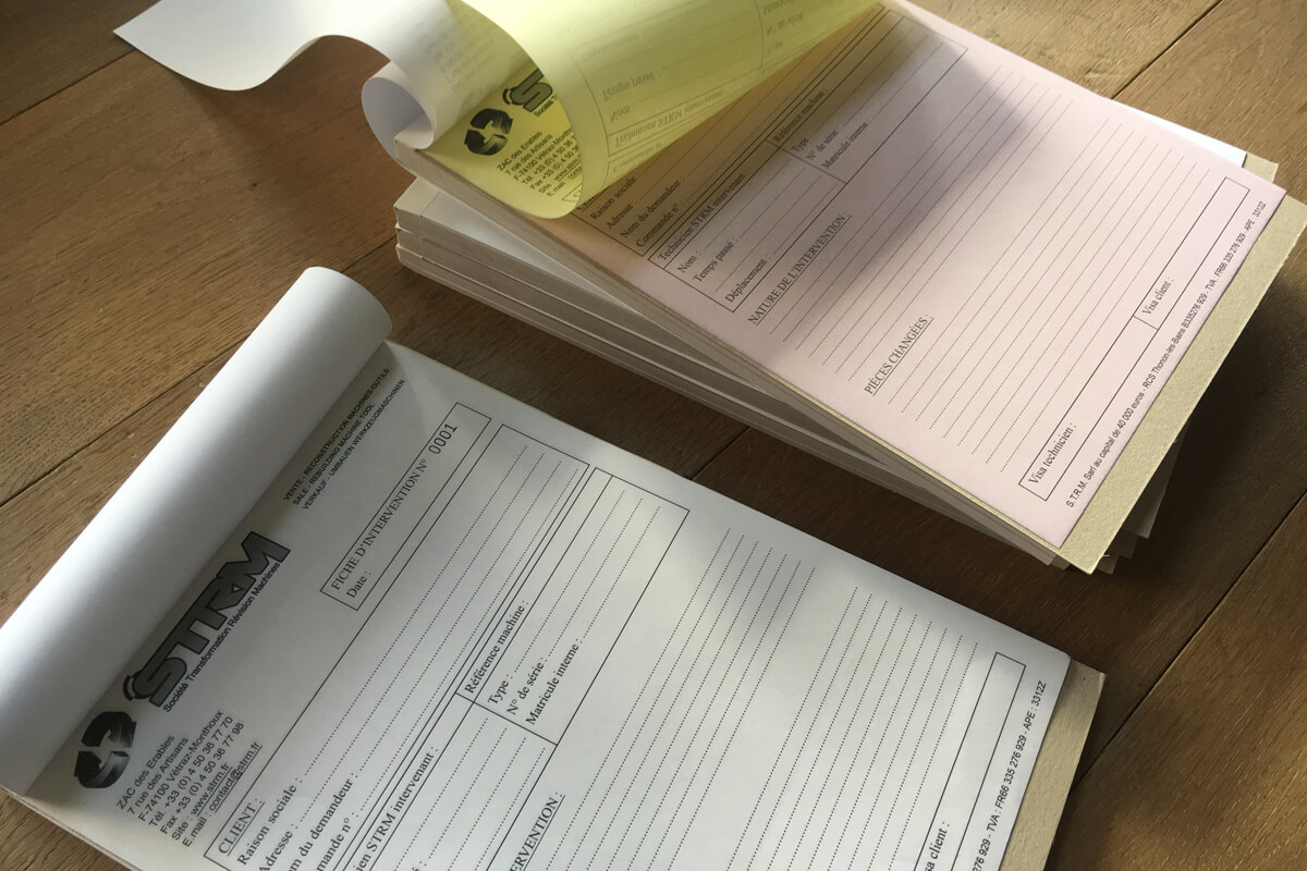 Solution : OAK-Webdesign réalise cette impression PRO pour la réédition des cartes de visites et créer le fichier print pour les carnets autocopiants. Un résultat à la hauteur des besoins de la société STRM.