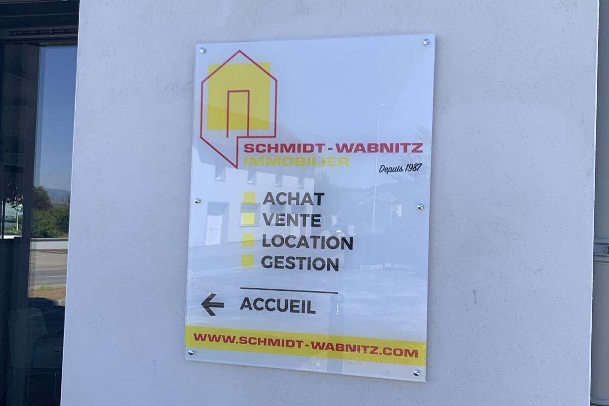 Objectifs : Après avoir réalisé le logo et les cartes de visite, l’agence Schmidt-Wabnitz immobilier a souhaité nous confier la réalisation graphique de ses enseignes, totem et panneau d’information permettant d’identifier visuellement ses nouveaux bureaux de Bons-en-Chablais.