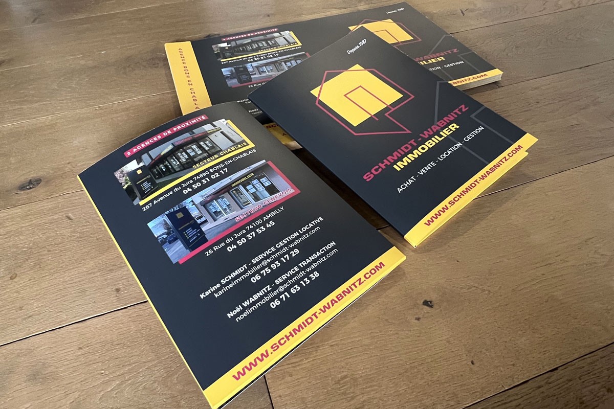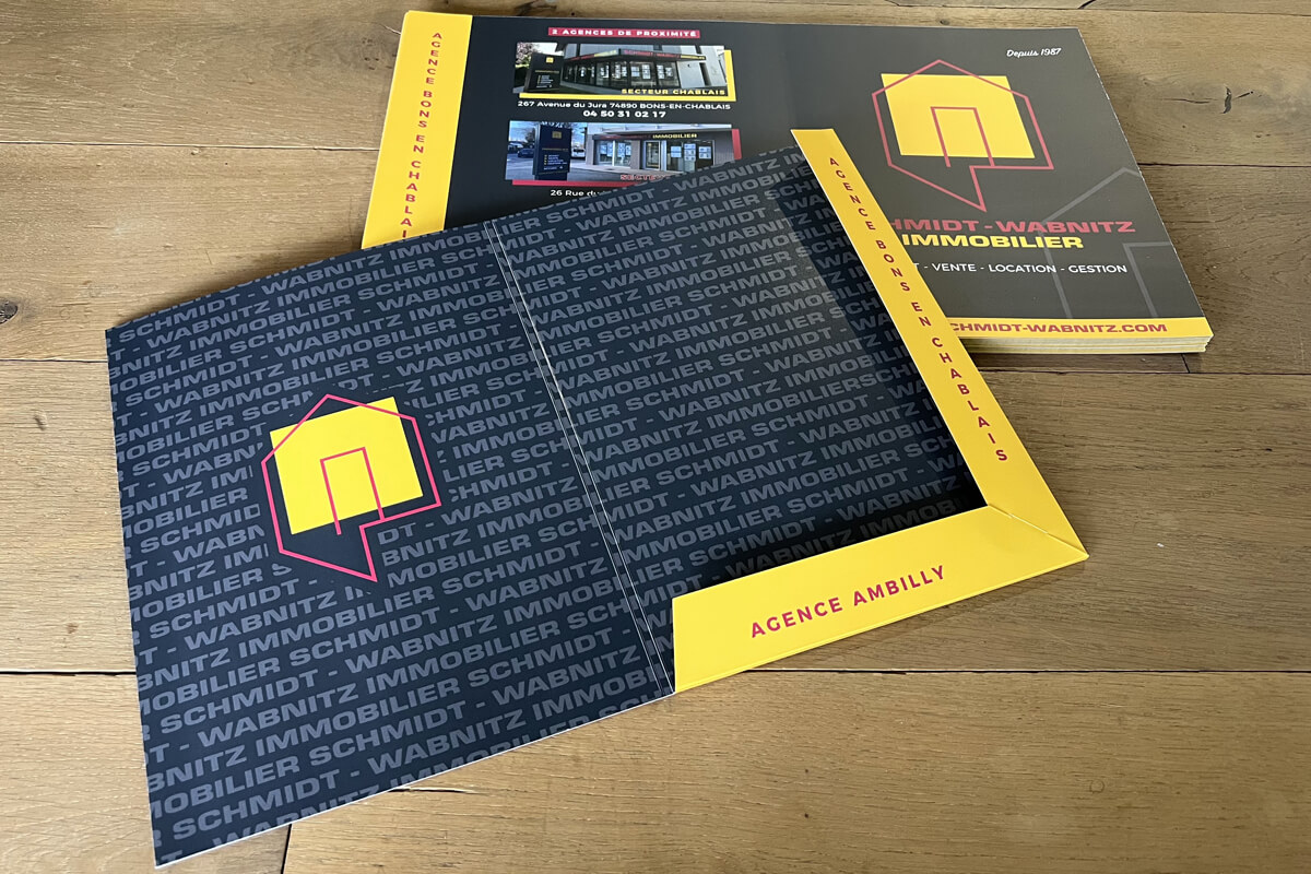 - Pochette à rabats = Impression quadri sur papier couché mat 350g avec pelliculage mat & double rainage