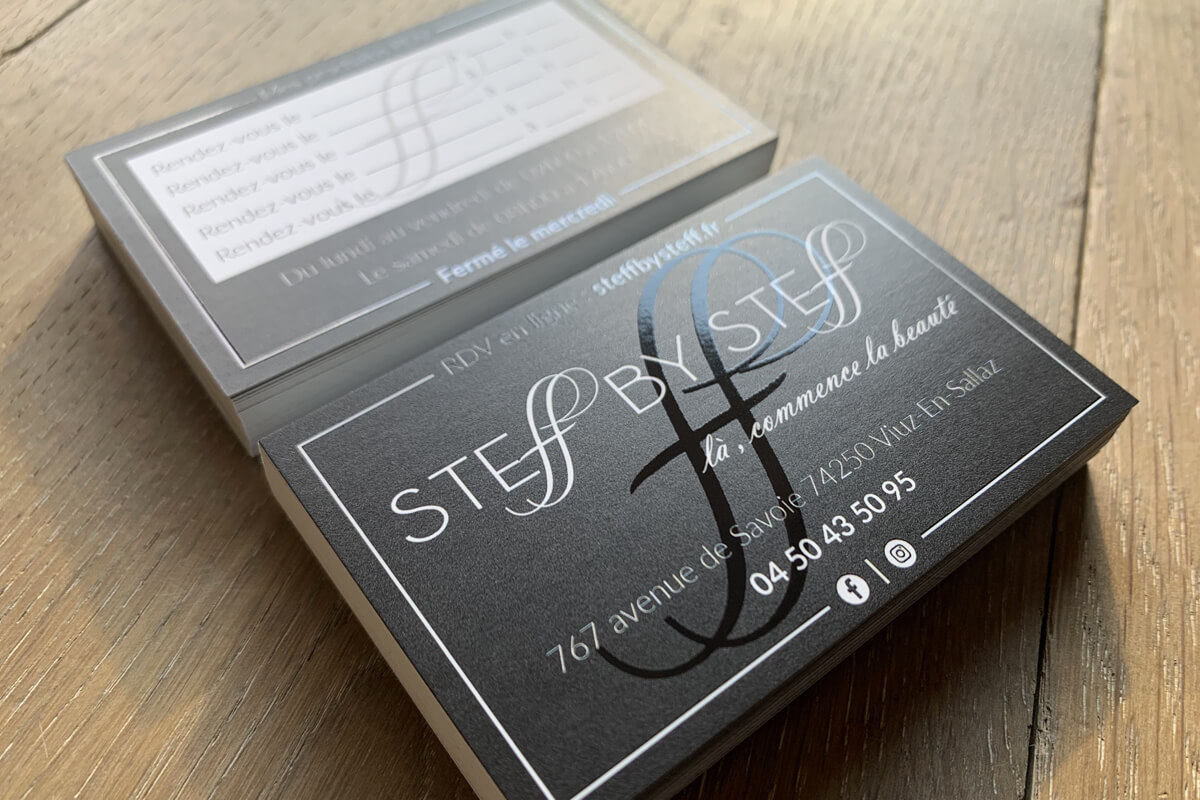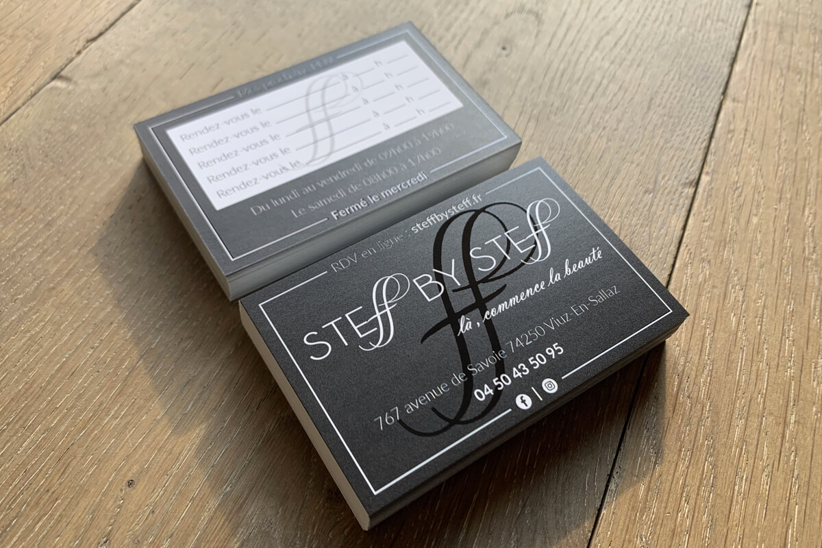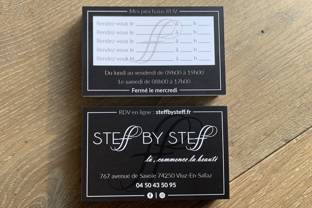Objectifs : Le salon Steff By Steff change d’adresse. A cette occasion notre client souhaitait des cartes de rendez-vous à l’image de sa nouvelle enseigne.