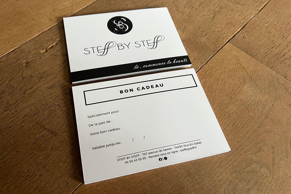 - Bons cadeaux = Impression quadri sur papier couché mat 300g & Pelliculage SoftTouch au recto