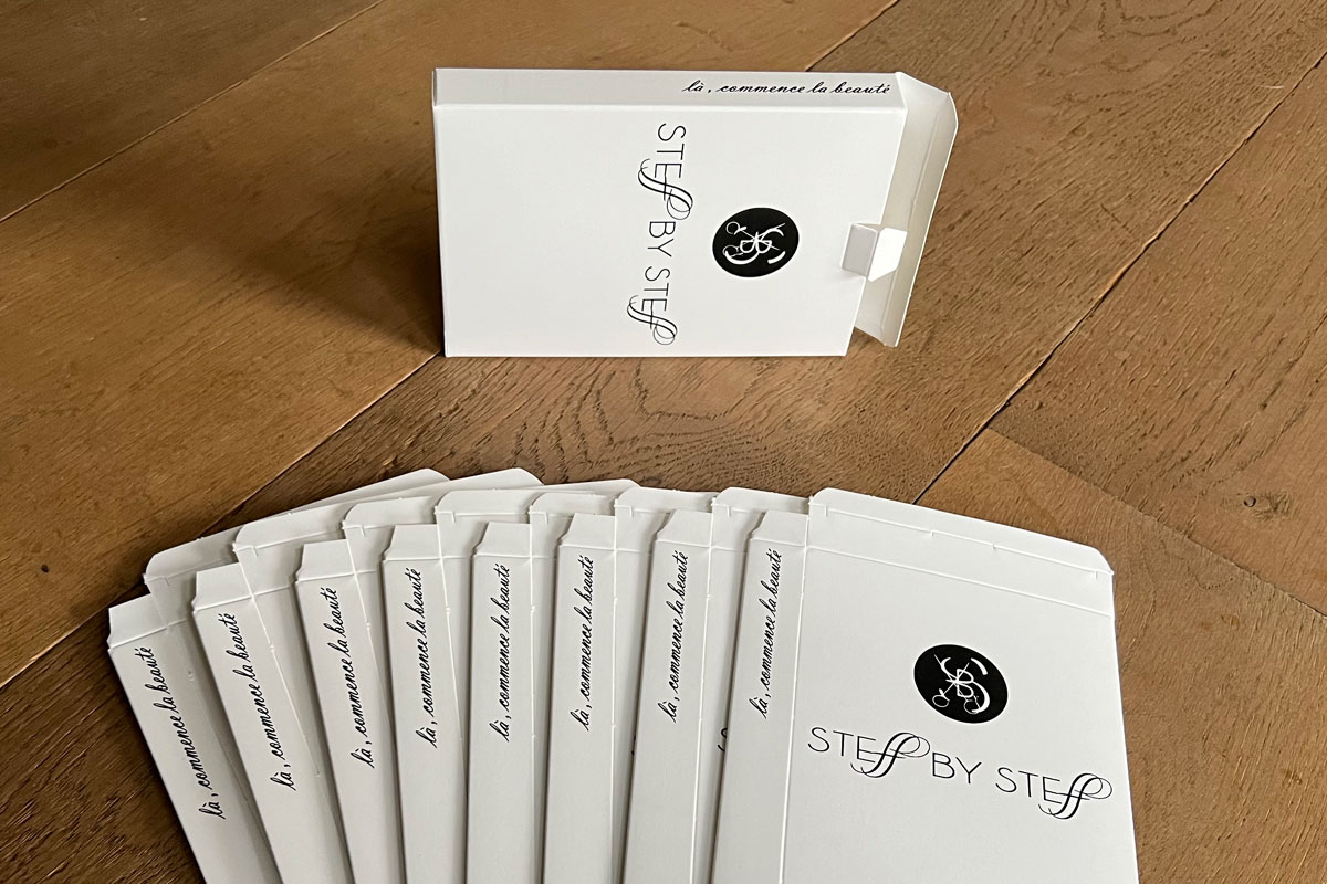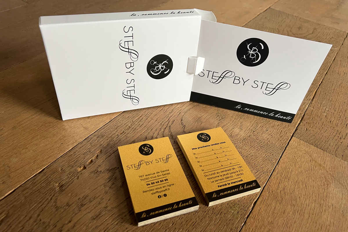 Objectifs : Avec la refonte de son logo, notre client souhaitait revoir l’esprit graphique de ses cartes de visite et créer des bons cadeaux accompagnés de boites en prévision des fêtes.