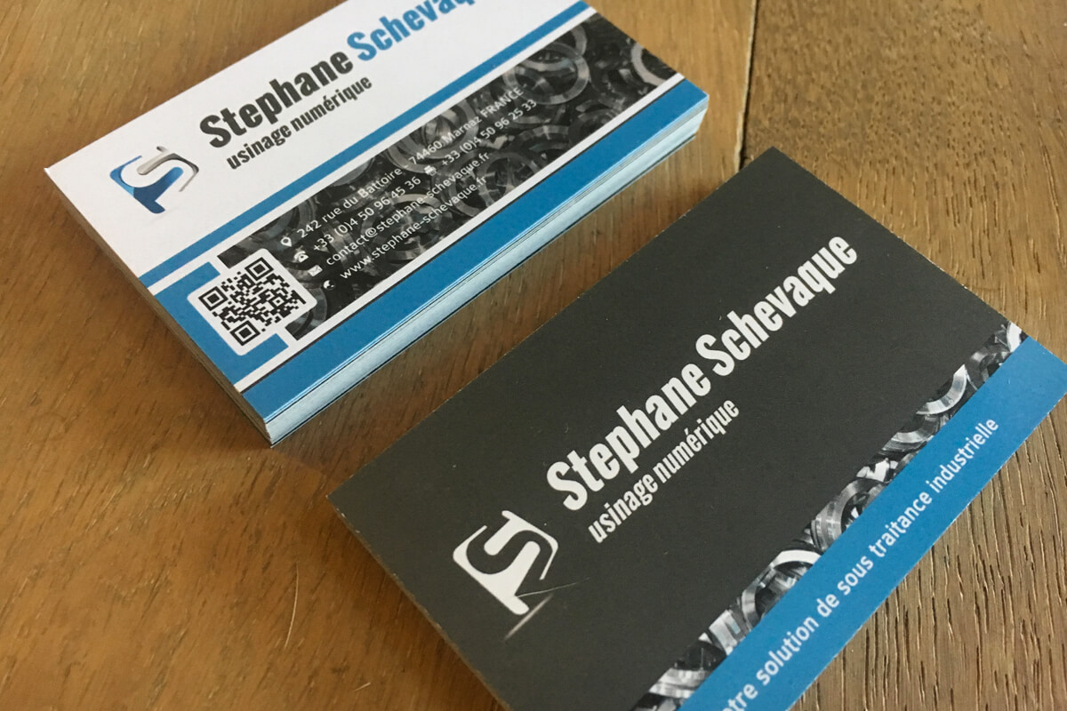 - Cartes de visite : Impression quadri sur papier couché mat 350g & Finition vernis