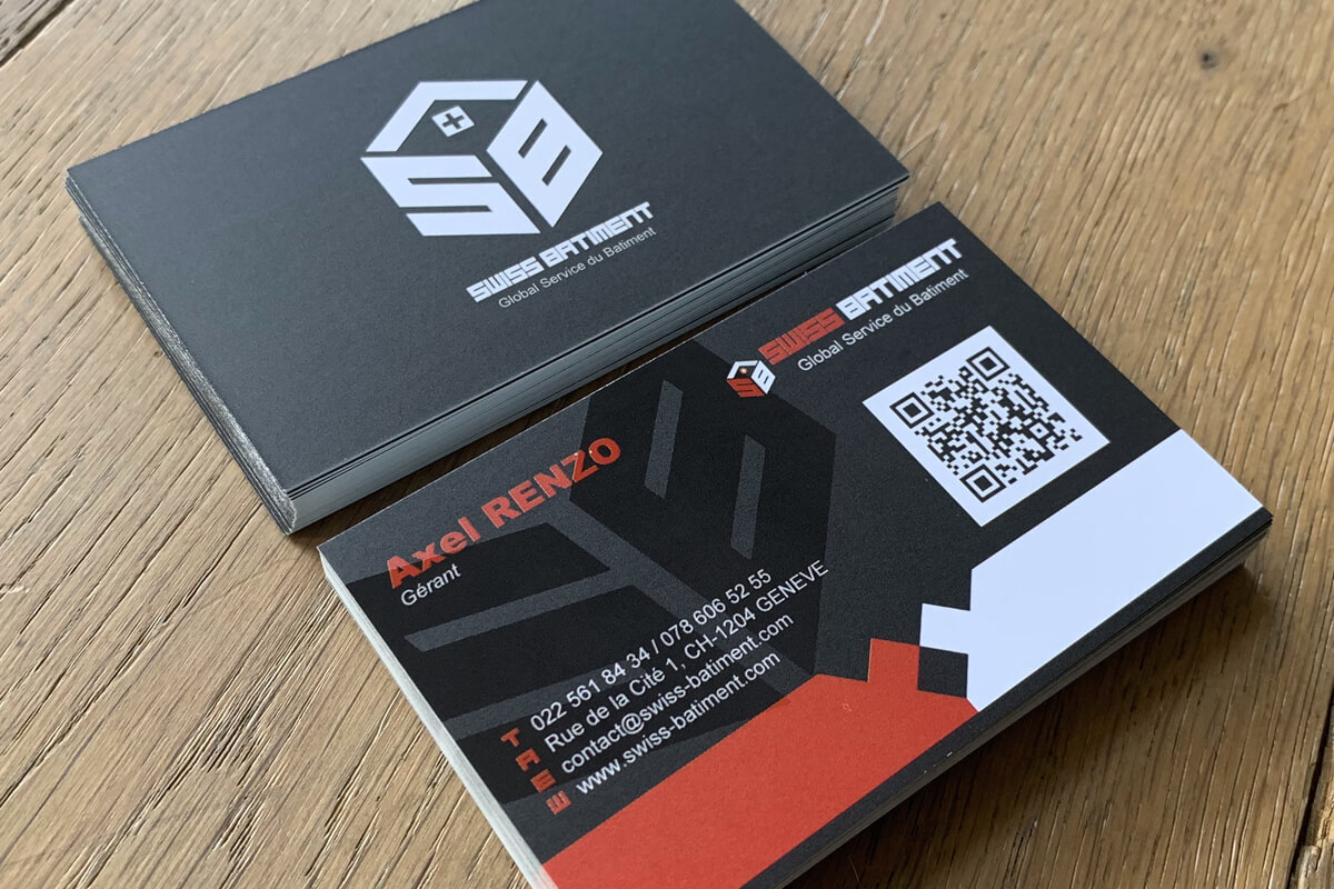 - Carte de visite : Impression quadri sur papier couché mat 350g & Finition vernis sélectif
