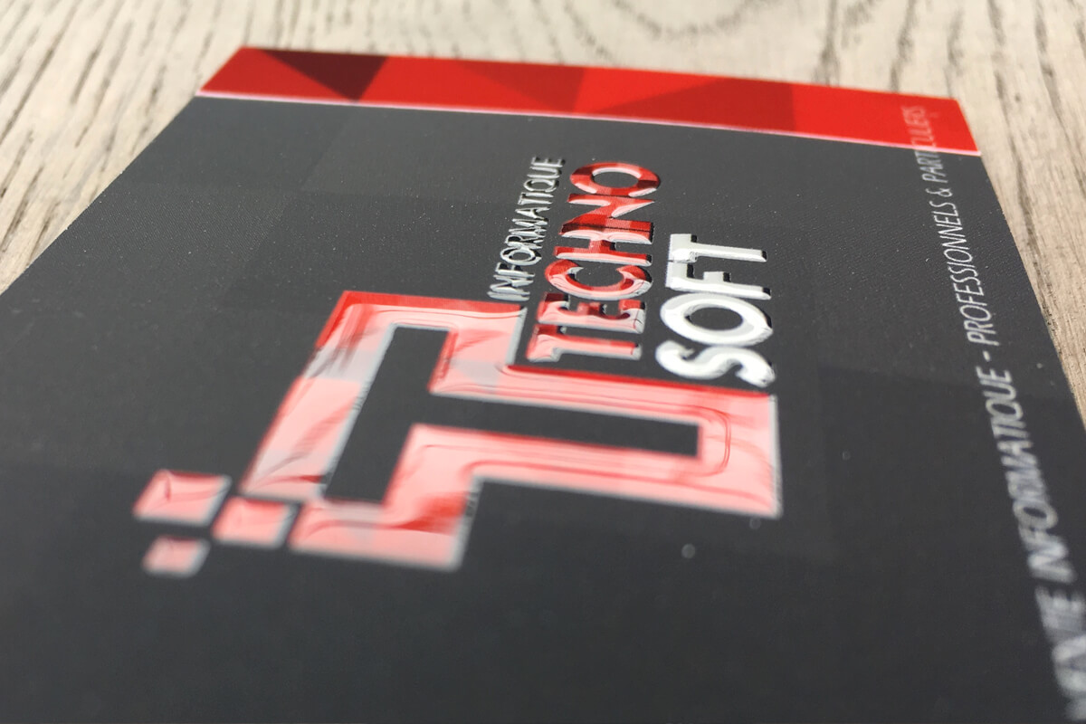 - Carte de visite : Impression quadri sur papier couché mat 350g & Pelliculage Soft Touch + Finition vernis sélectif 3D